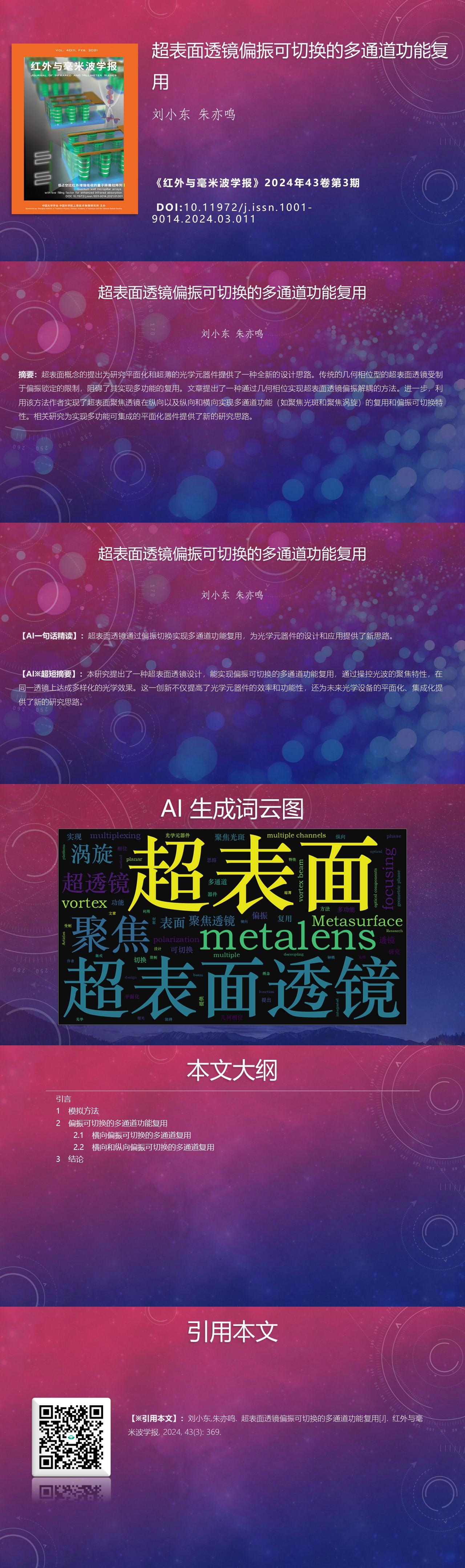 Xiao-Dong LIU, Yi-Ming ZHU. Metalens for polarization-switchable multi-functions multiplexing in multiple channels[J]. Journal of Infrared and Millimeter Waves, 2024, 43(3): 369