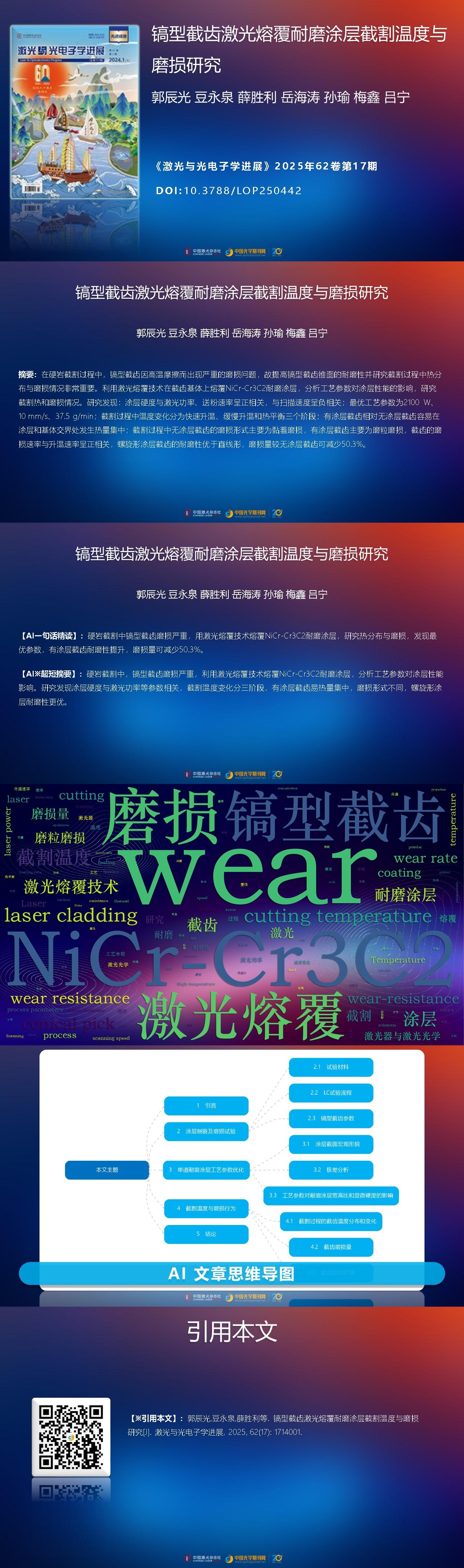 Chenguang Guo, Yongquan Dou, Shengli Xue, Haitao Yue, Yu Sun, Xin Mei, Ning Lü. Cutting Temperature and Wear of Conical Picks with Laser Cladding Wear-Resistant Coating[J]. Laser & Optoelectronics Progress, 2025, 62(17): 1714001