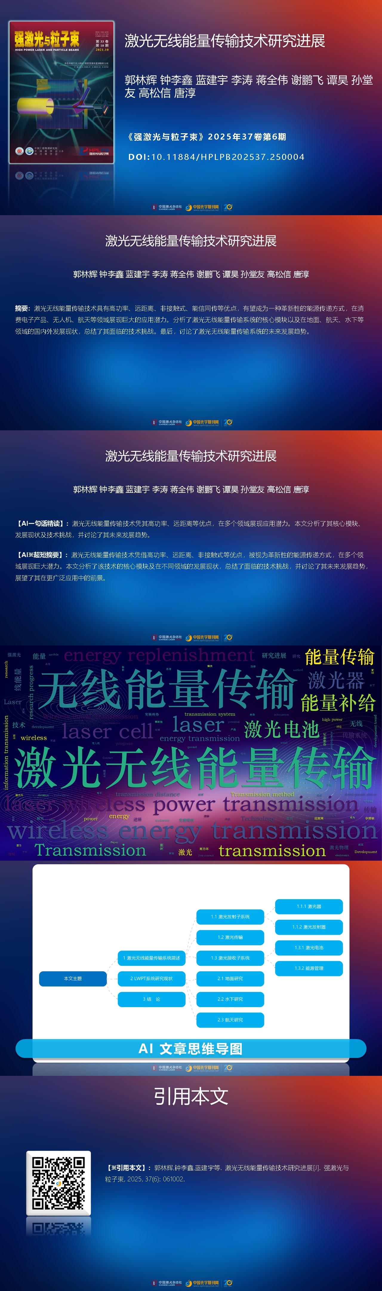 Linhui Guo, Lixin Zhong, Jianyu Lan, Tao Li, Quanwei Jiang, Pengfei Xie, Hao Tan, Tangyou Sun, Songxin Gao, Chun Tang. Research progress of laser wireless power transmission technology[J]. High Power Laser and Particle Beams, 2025, 37(6): 061002