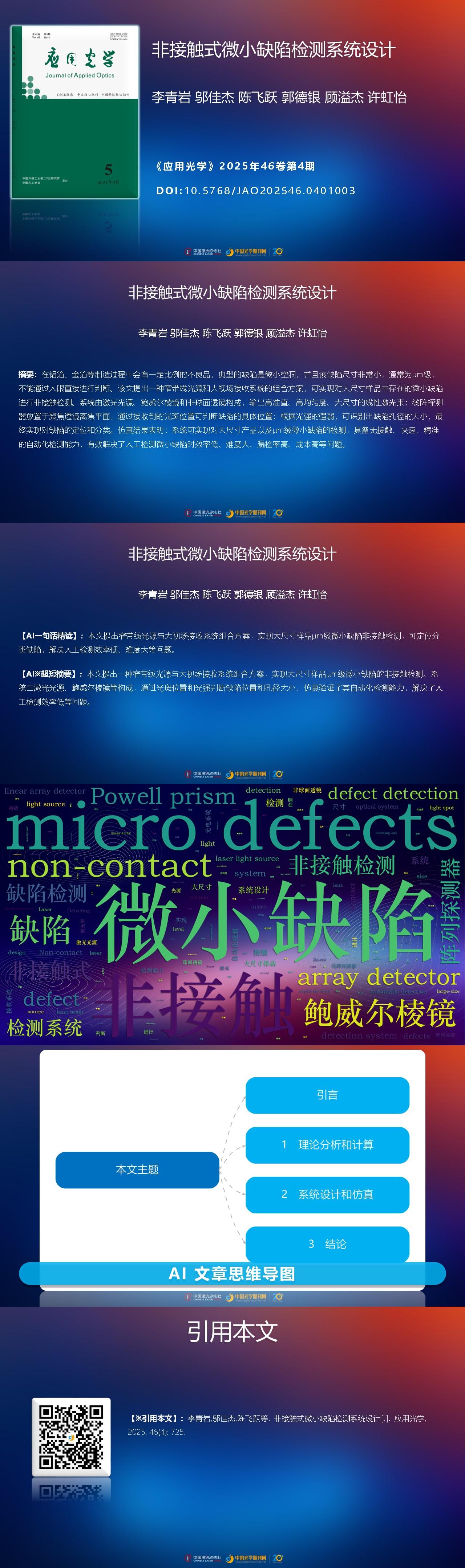 Qingyan LI, Jiajie WU, Feiyue CHEN, Deyin GUO, Yijie GU, Hongyi XU. Design of non-contact micro defect detection system[J]. Journal of Applied Optics, 2025, 46(4): 725