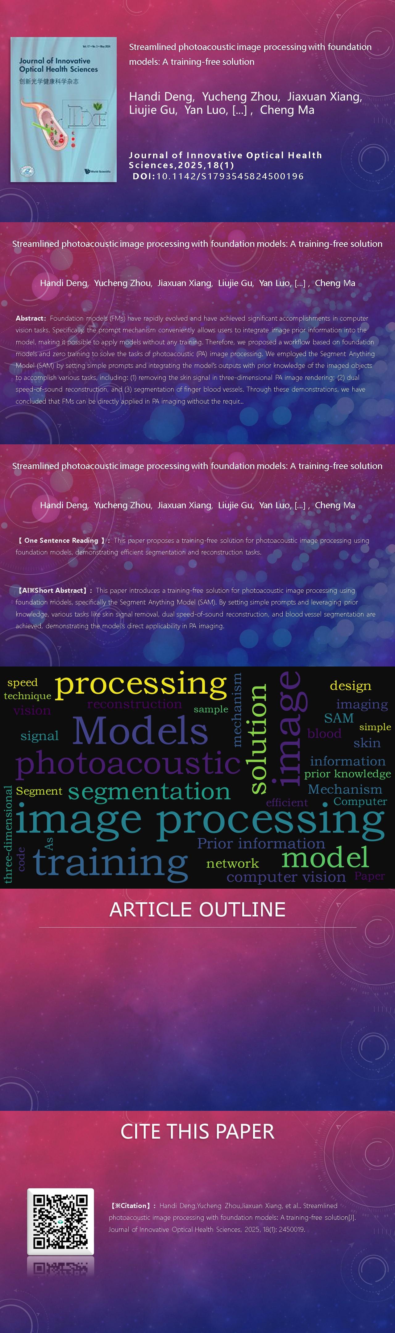 Handi Deng, Yucheng Zhou, Jiaxuan Xiang, Liujie Gu, Yan Luo, Hai Feng, Mingyuan Liu, Cheng Ma. Streamlined photoacoustic image processing with foundation models: A training-free solution[J]. Journal of Innovative Optical Health Sciences, 2025, 18(1): 2450019