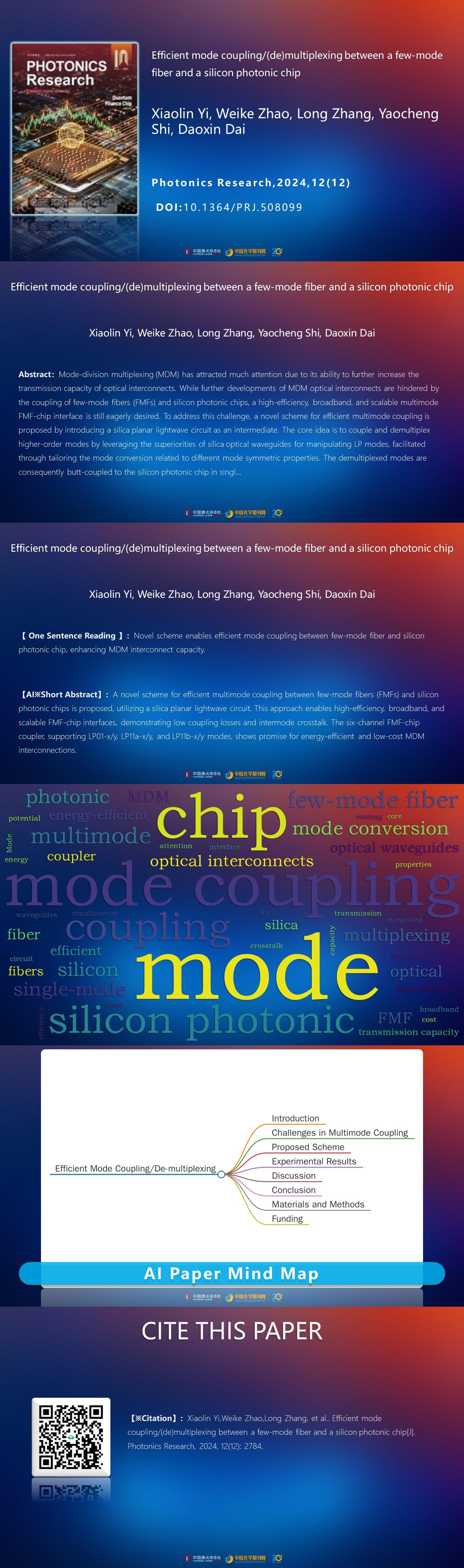 【AIGC One Sentence Reading】:Novel scheme enables efficient mode coupling between few-mode fiber and silicon photonic chip, enhancing MDM interconnect capacity.