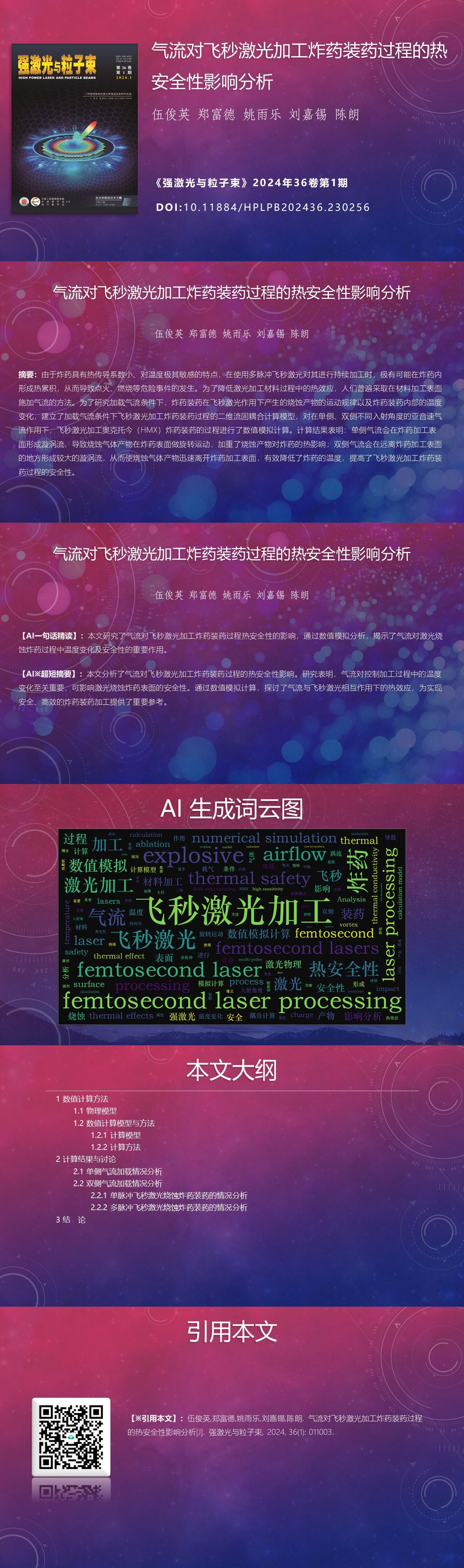 Junying Wu, Fude Zheng, Yule Yao, Jiaxi Liu, Lang Chen. Analysis of thermal safety impact of airflow on the process of femtosecond laser processing explosive charge[J]. High Power Laser and Particle Beams, 2024, 36(1): 011003