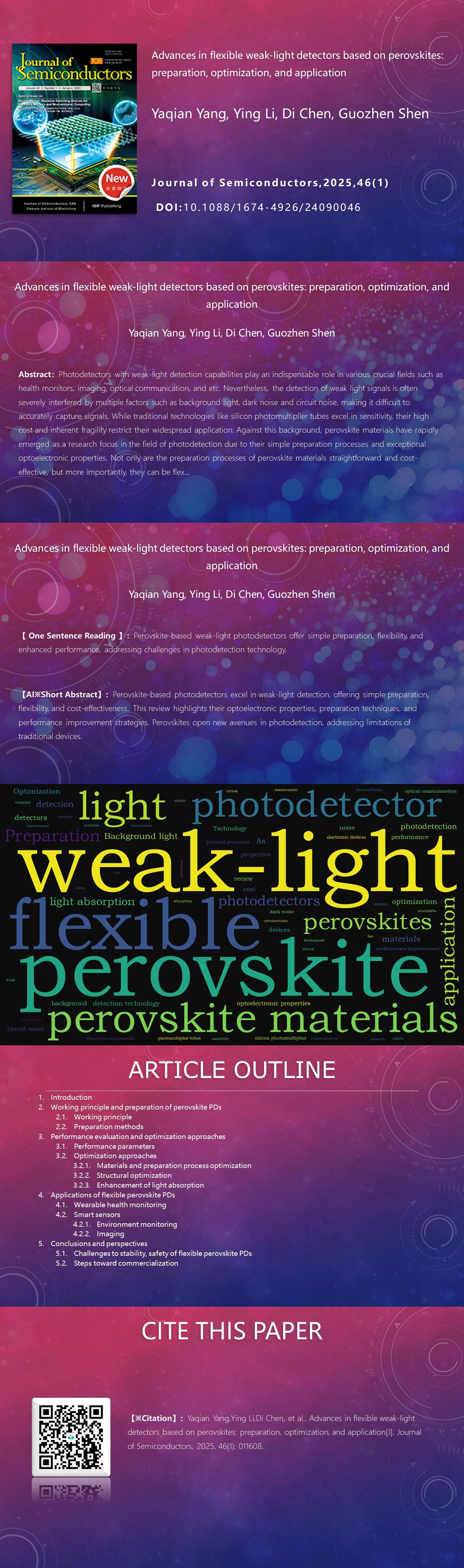 Yaqian Yang, Ying Li, Di Chen, Guozhen Shen. Advances in flexible weak-light detectors based on perovskites: preparation, optimization, and application[J]. Journal of Semiconductors, 2025, 46(1): 011608