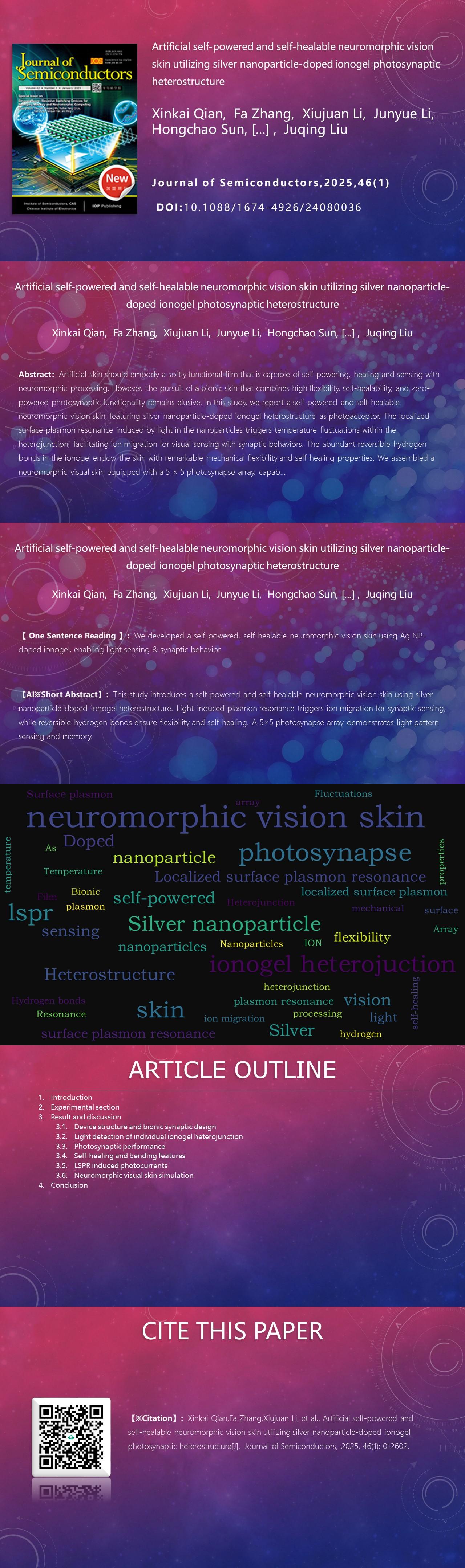 Xinkai Qian, Fa Zhang, Xiujuan Li, Junyue Li, Hongchao Sun, Qiye Wang, Chaoran Huang, Zhenyu Zhang, Zhe Zhou, Juqing Liu. Artificial self-powered and self-healable neuromorphic vision skin utilizing silver nanoparticle-doped ionogel photosynaptic heterostructure[J]. Journal of Semiconductors, 2025, 46(1): 012602