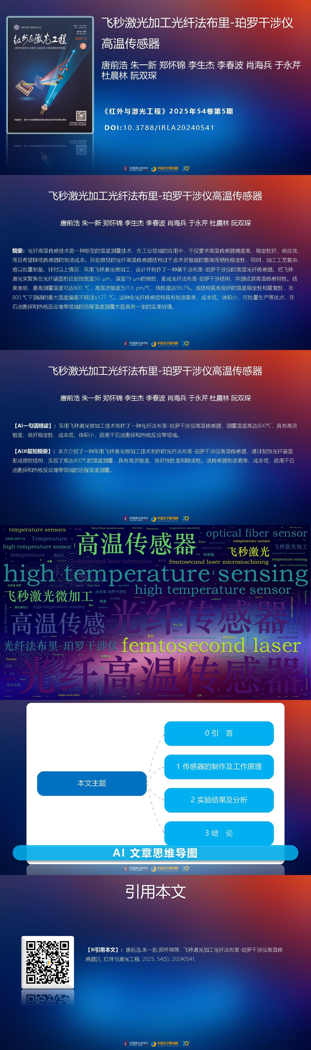 ConclusionA high-temperature optic fiber sensor based on Fabry-Perot interferometer was designed and fabricated by using femtosecond laser microfabrication. The sensor has high accuracy, good stability, compact probe structure, small size, flexibility, and strong adaptability. It has potential application value in high-temperature measurement environments with long distances and narrow spaces. Three different sizes of samples were prepared in the experiment, verifying the feasibility of the processing technology and providing certain reference value for industrial low-cost and mass production.
