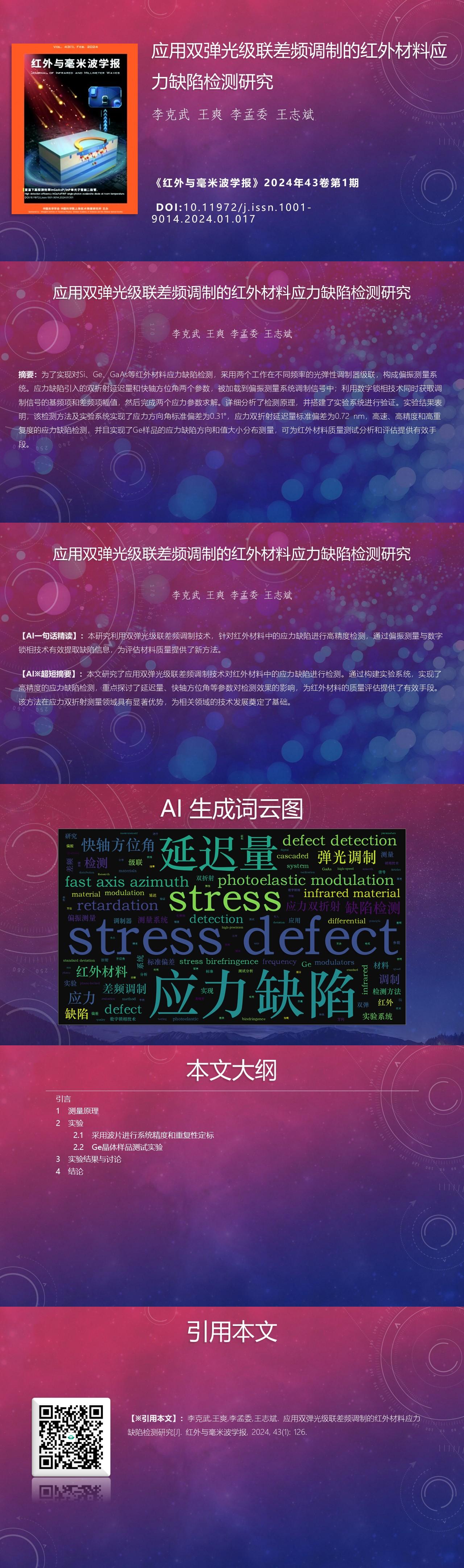 Ke-Wu LI, Shuang WANG, Meng-Wei LI, Zhi-Bin WANG. Research on the stress defect detection of infrared material using differential frequency modulation with cascaded dual photoelastic modulators[J]. Journal of Infrared and Millimeter Waves, 2024, 43(1): 126