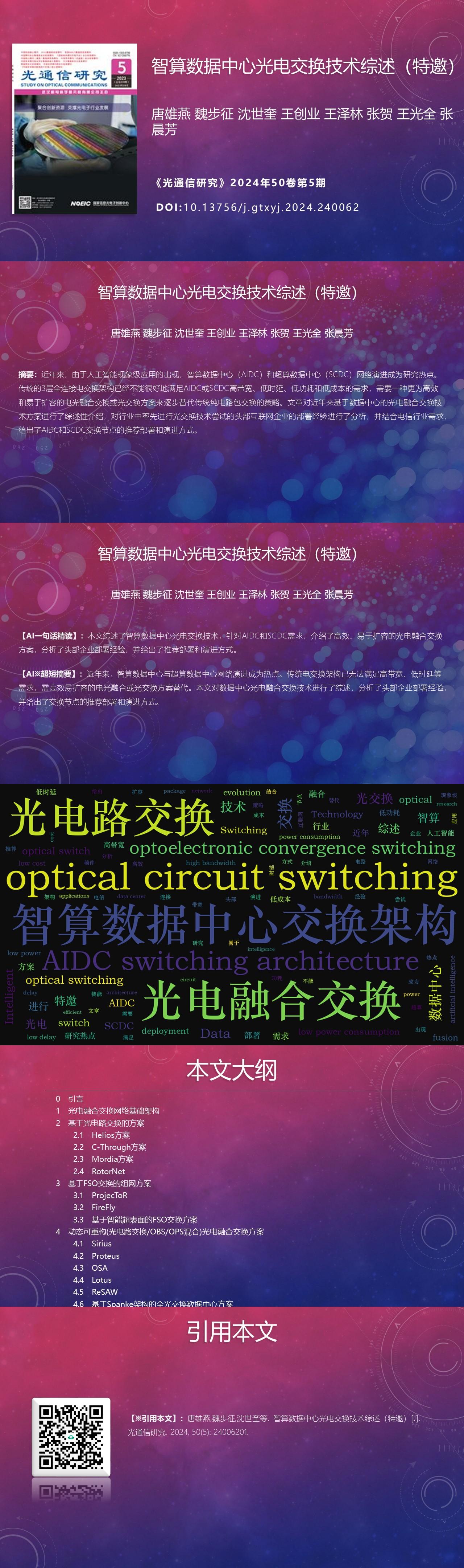 Xiongyan TANG, Buzheng WEI, Shikui SHEN, Chuangye WANG, Zelin WANG, He ZHANG, Guangquan WANG, Chenfang ZHANG. Overview of Optoelectronic Switching Technology in Artificial Intelligent Data Centers[J]. Study On Optical Communications, 2024, 50(5): 24006201