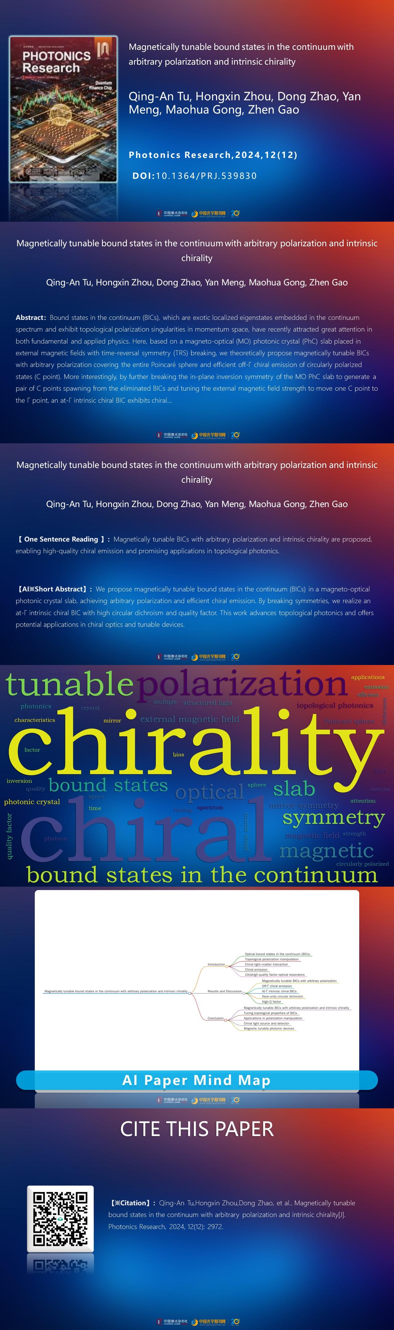 Qing-An Tu, Hongxin Zhou, Dong Zhao, Yan Meng, Maohua Gong, Zhen Gao, "Magnetically tunable bound states in the continuum with arbitrary polarization and intrinsic chirality," Photonics Res. 12, 2972 (2024)