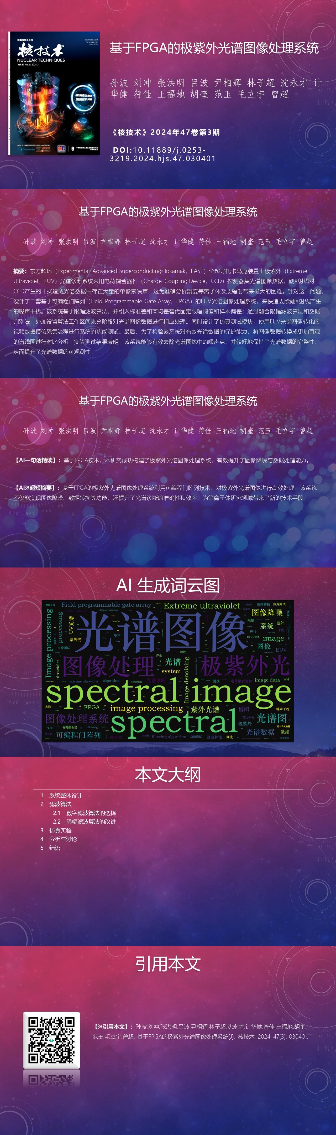 Bo SUN, Chong LIU, Hongming ZHANG, Bo LYU, Xianghui YIN, Zichao LIN, Yongcai SHEN, Huajian JI, Jia FU, Fudi WANG, Kui HU, Yu FAN, Liyu MAO, Chao ZENG. Extreme ultraviolet spectral image processing system based on FPGA[J]. NUCLEAR TECHNIQUES, 2024, 47(3): 030401