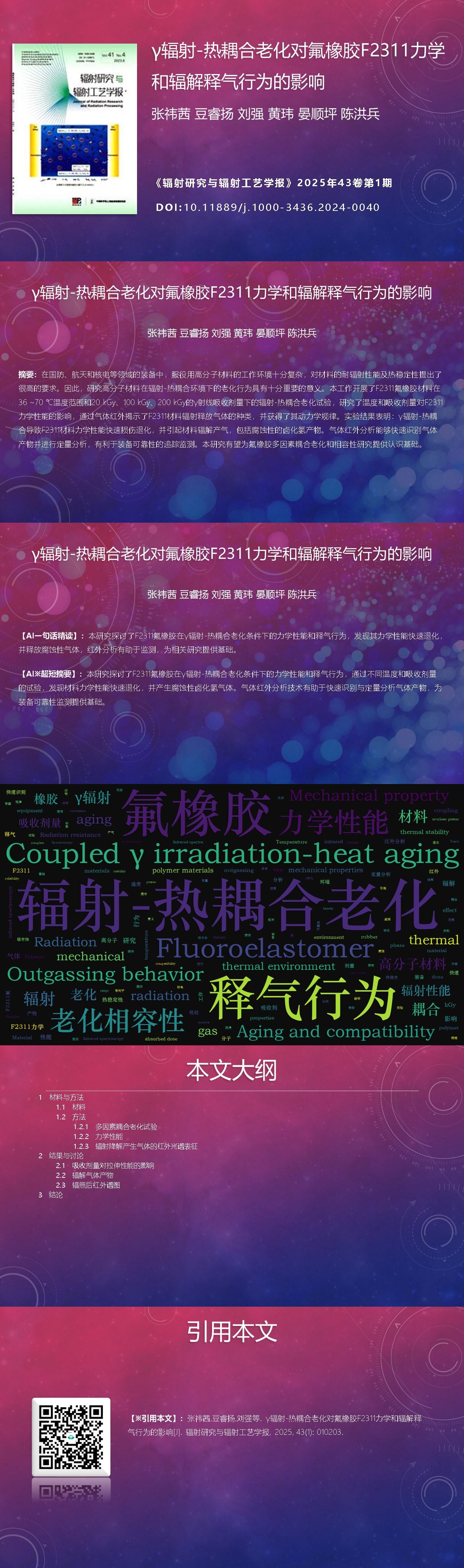 Yiqian ZHANG, Ruiyang DOU, Qiang LIU, Wei HUANG, Shunping YAN, Hongbing CHEN. Effect of γ-radiation-thermal coupling aging on the mechanical and radiolytic gas behavior of F2311 fluoroelastomer[J]. Journal of Radiation Research and Radiation Processing, 2025, 43(1): 010203