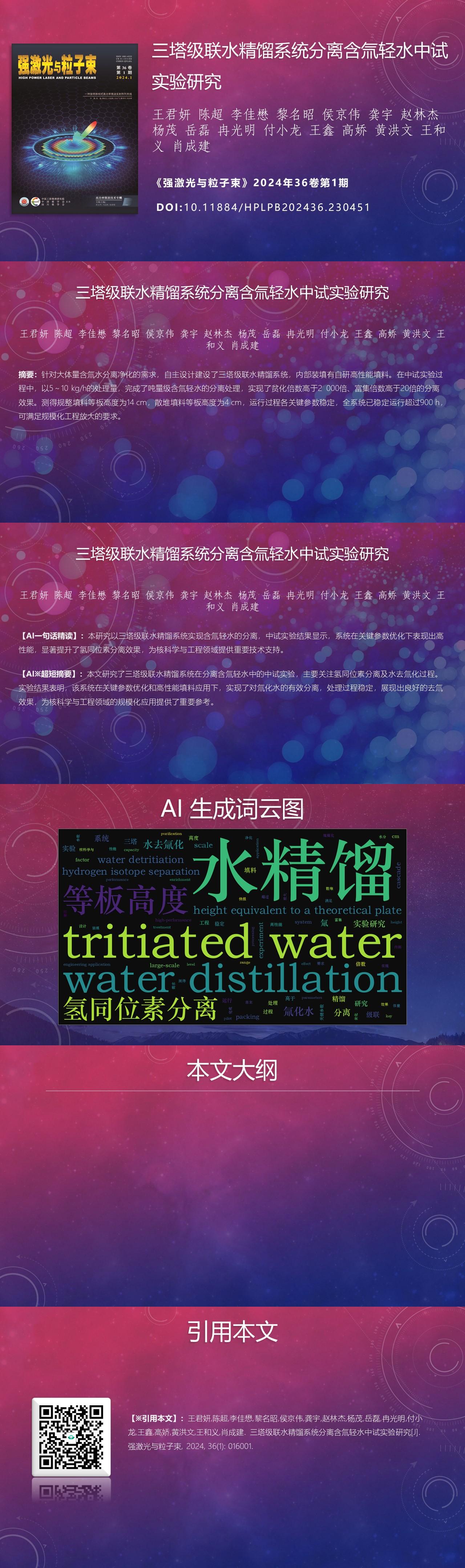 Junyan Wang, Chao Chen, Jiamao Li, Mingzhao Li, Jingwei Hou, Yu Gong, Linjie Zhao, Mao Yang, Lei Yue, Guangming Ran, Xiaolong Fu, Xin Wang, Jiao Gao, Hongwen Huang, Heyi Wang, Chengjian Xiao. Pilot scale experiment of three-column cascade water distillation facility for tritiated water separation[J]. High Power Laser and Particle Beams, 2024, 36(1): 016001