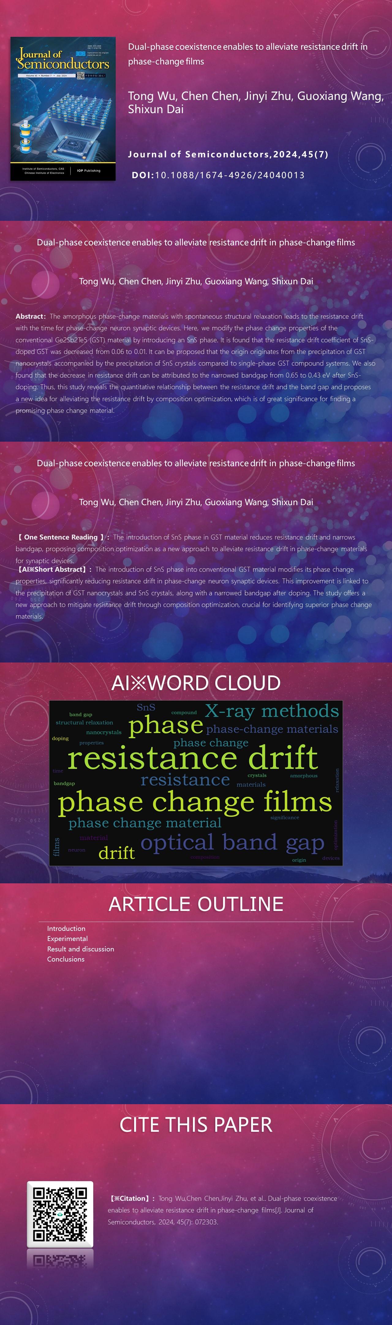 Tong Wu, Chen Chen, Jinyi Zhu, Guoxiang Wang, Shixun Dai. Dual-phase coexistence enables to alleviate resistance drift in phase-change films[J]. Journal of Semiconductors, 2024, 45(7): 072303