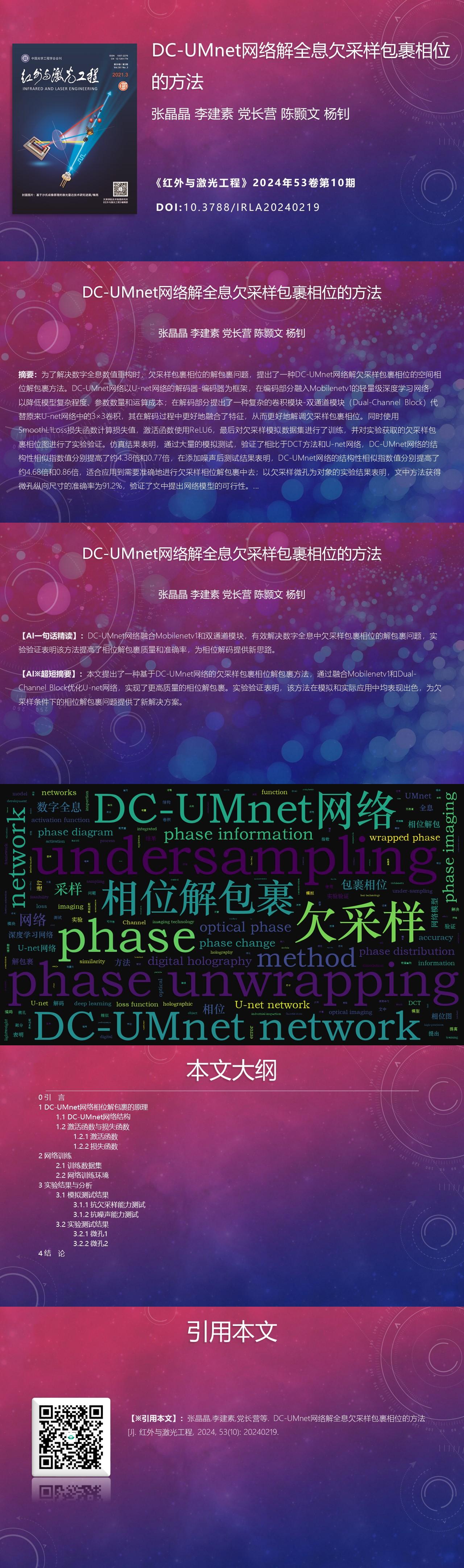 Results and DiscussionsThe simulation results in Fig.6-Fig.7 show the feasibility of the undersampling phase unwrapping of the method proposed, and the evaluated results according to the structural similarity index are more satisfactory. Comparing with the U-net network and the DCT method, the simulation results show that the structural similarity index values of the DC-UMnet network are improved by about 4.38 and 0.77 times. After adding noise, the test results show that the structural similarity index of DC-UMnet network increases about 4.68 times and 0.86 times. The experimental results with undersampling microscopic hole as the object shows that the proposed method has a smaller error. And the lateral error of the undersampling microscopic hole size obtained by the proposed method was 2.1 μm and the longitudinal error was 86.7 nm. The accuracy of this paper's method for extracting undersampling phase information is proved, which promotes its further development in the field of optical phase imaging and other fields.