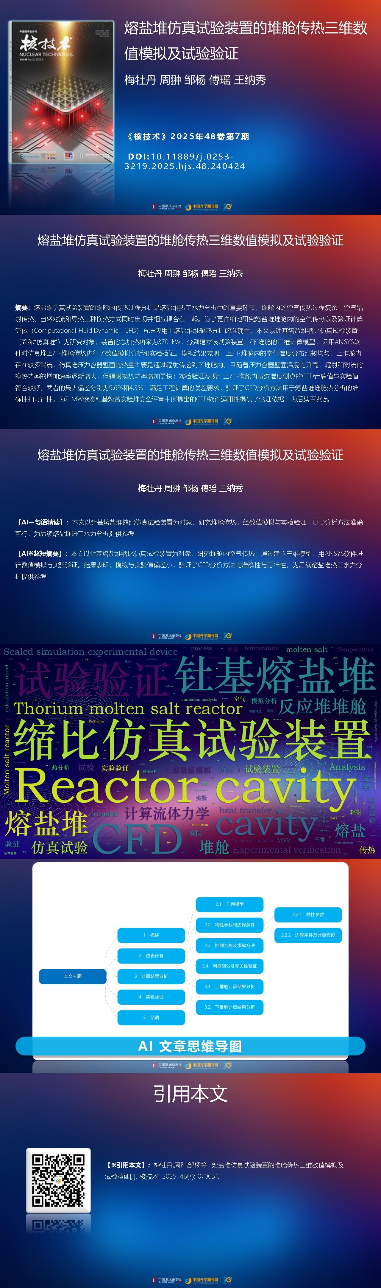 Mudan MEI, Chong ZHOU, Yang ZOU, Yao FU, Naxiu WANG. Numerical simulation analysis and experimental validation for the reactor cavity of molten salt reactor[J]. NUCLEAR TECHNIQUES, 2025, 48(7): 070031