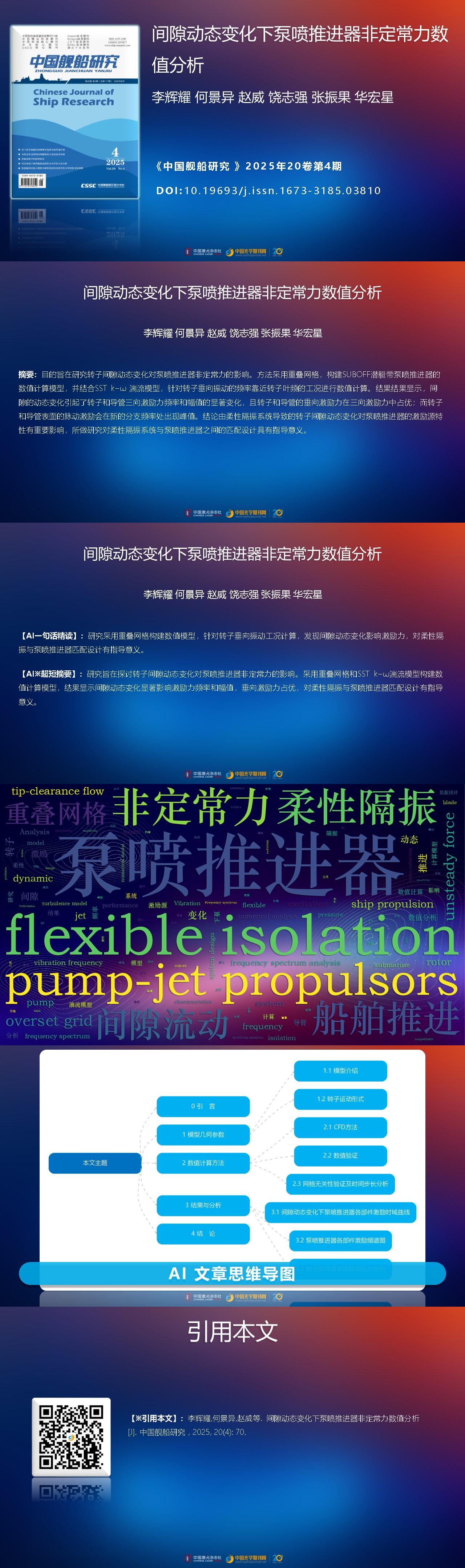Huiyao LI, Jingyi HE, wei ZHAO, Zhiqiang RAO, Zhenguo ZHANG, Hongxing HUA. Numerical analysis of unsteady forces in a pump-jet propulsor due to dynamic tip-clearance changes[J]. Chinese Journal of Ship Research, 2025, 20(4): 70
