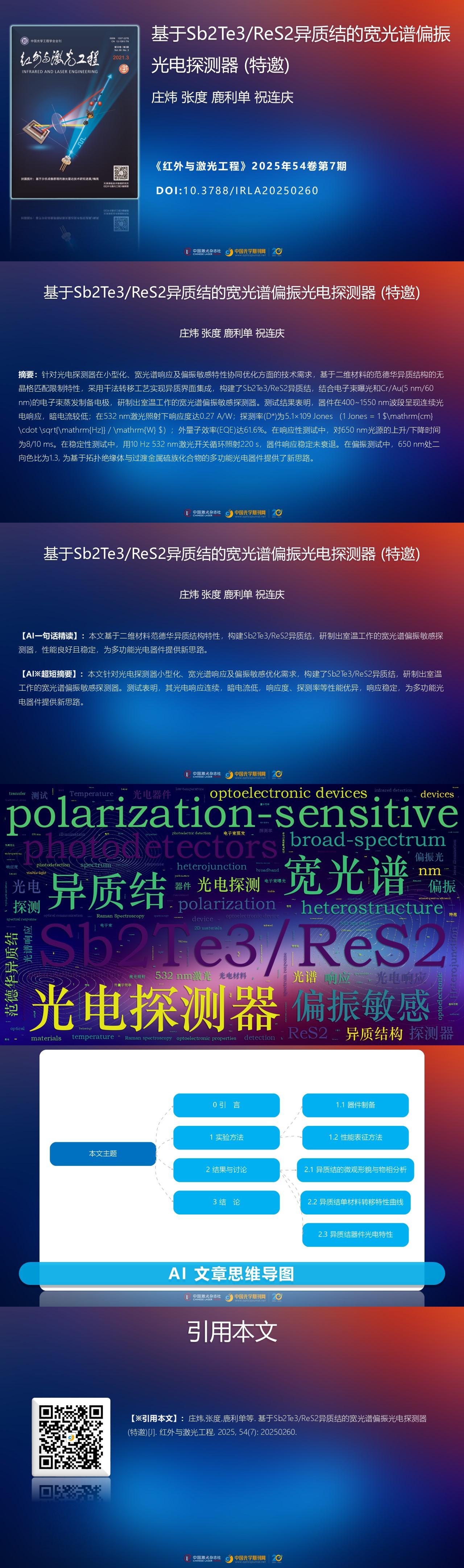 ObjectivePhotodetectors, as multifunctional devices and critical components of photoelectric detection technology, play a pivotal role in converting optical signals into electrical signals within photoelectric systems. Their applications span diverse fields, including infrared detection and night-vision equipment in defense technology, visible-light detection in consumer cameras, and optical communication satellites, demonstrating significant practical value and broad prospects. However, the growing demand for miniaturized, broadband, and polarization-sensitive photodetectors poses new challenges, particularly in developing multifunctional devices capable of room-temperature operation, wide-spectrum response, and polarized-light detection. Sb