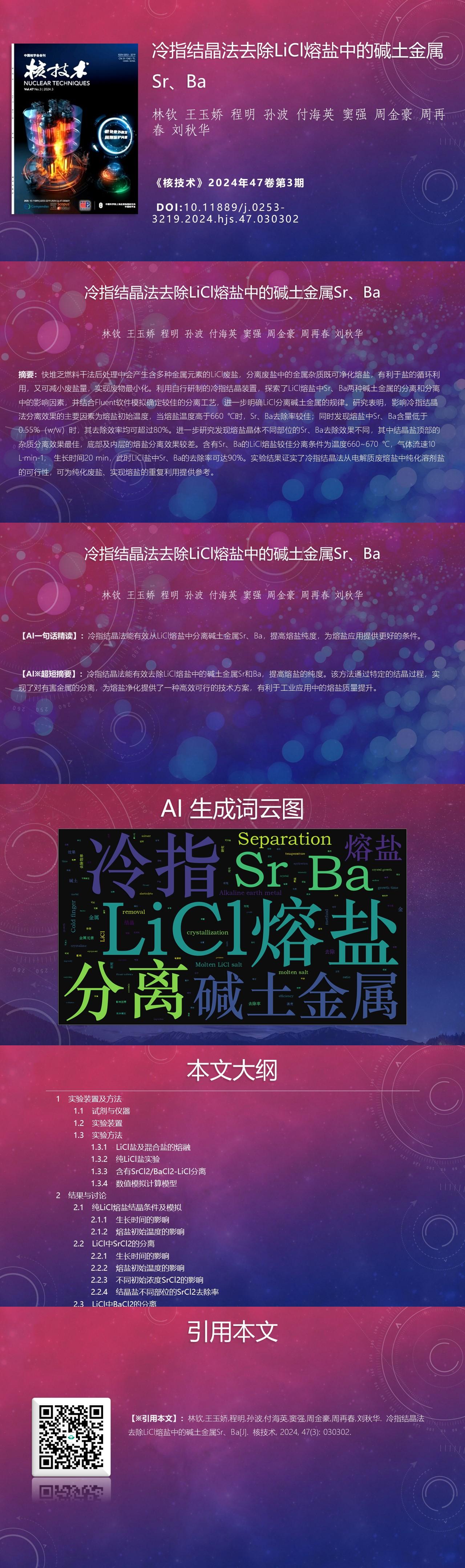 Qin LIN, Yujiao WANG, Ming CHENG, Bo SUN, Haiying FU, Qiang DOU, Jinhao ZHOU, Zaichun ZHOU, Qiuhua LIU. Removal of Sr and Ba from molten LiCl salt using cold finger crystallization method[J]. NUCLEAR TECHNIQUES, 2024, 47(3): 030302