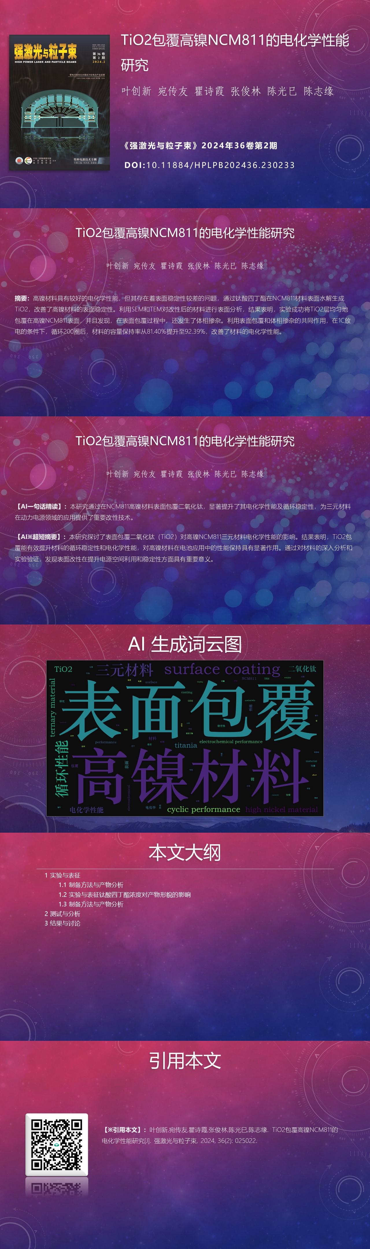 Chuangxin Ye, Chuanyou Wan, Shixia Qu, Junlin Zhang, Guangsi Chen, Zhiyuan Chen. Study on the electrochemical performance of TiO2 coating on high nickel NCM811[J]. High Power Laser and Particle Beams, 2024, 36(2): 025022
