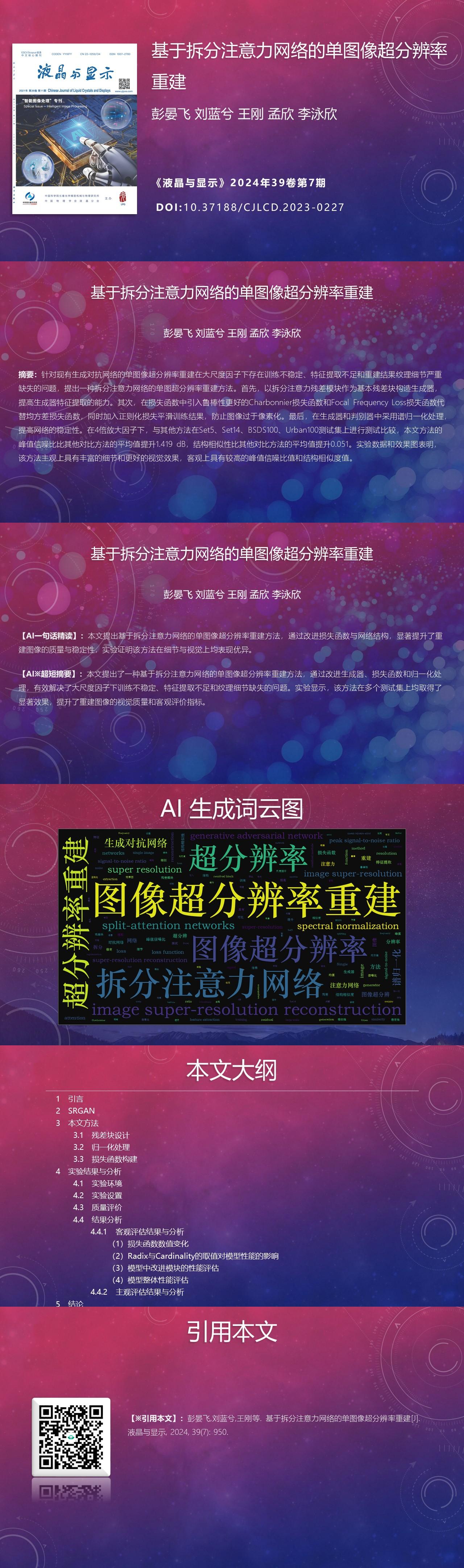 Yanfei PENG, Lanxi LIU, Gang WANG, Xin MENG, Yongxin LI. Single image super-resolution reconstruction based on split-attention networks[J]. Chinese Journal of Liquid Crystals and Displays, 2024, 39(7): 950