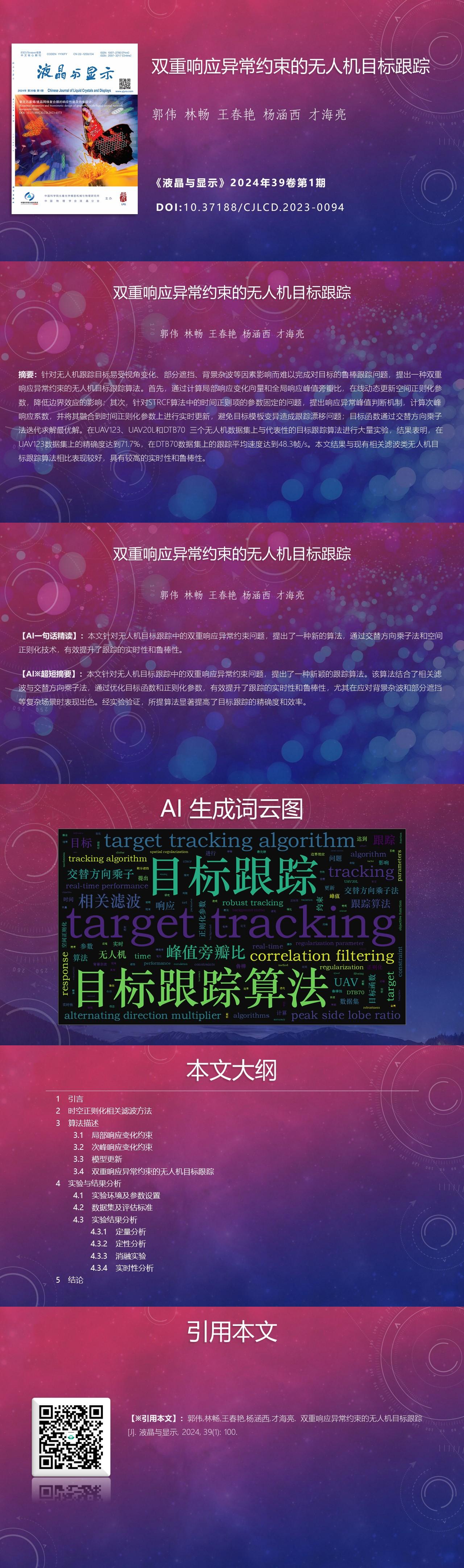 Wei GUO, Chang LIN, Chunyan WANG, Hanxi YANG, Hailiang CAI. UAV target tracking with dual response anomaly constraint[J]. Chinese Journal of Liquid Crystals and Displays, 2024, 39(1): 100