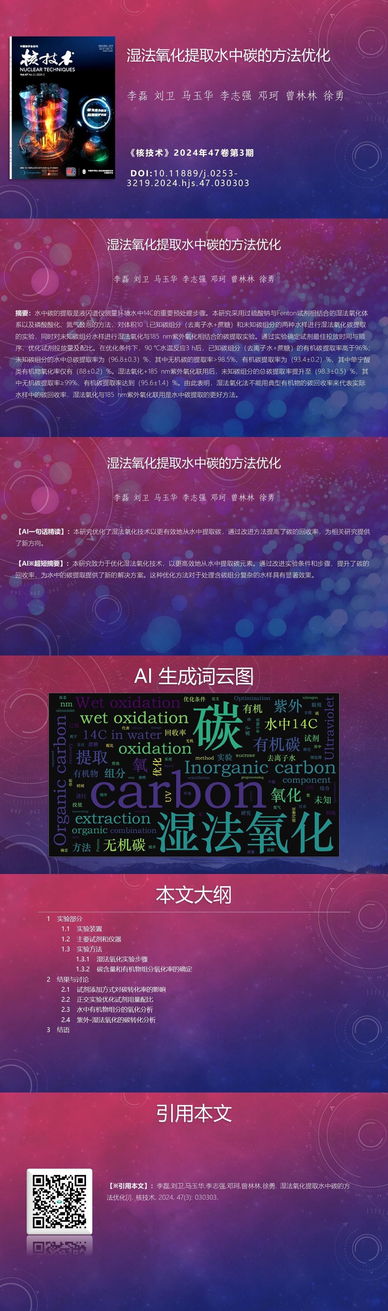 Lei LI, Wei LIU, Yuhua MA, Zhiqiang LI, Ke DENG, Linlin ZENG, Yong XU. Optimization of carbon extraction from water by wet oxidation[J]. NUCLEAR TECHNIQUES, 2024, 47(3): 030303