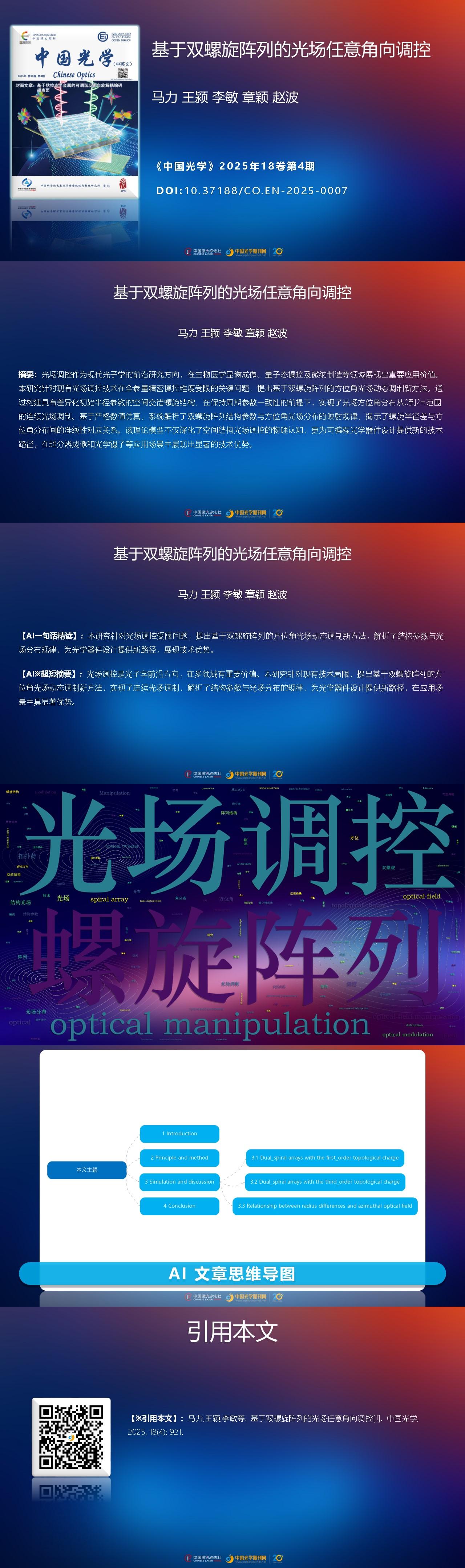 Optical field manipulation, a fundamental branch of modern optical research, focuses on the precise control of light propagation characteristics, including phase, amplitude, and polarization states[1]. This technology has been applied extensively in various fields. In optical communications[2], optical field manipulation significantly enhances bandwidth and transmission efficiency, driving advancements in information technology to meet the ever-growing data demands[3]. In microscopy and imaging systems[4], the manipulation of optical fields enhances resolution and contrast, driving progress in high-precision imaging technologies[5]. Furthermore, the precise control of optical fields enables micromachining of materials and laser fabrication, which have substantial applications in the manufacturing sector[6-7]. Optical field manipulation can also enhance the quality and characteristics of laser beams by enabling the generation of ultrashort pulse lasers[8], thereby fostering innovation in laser technology[9]. In terms of application prospects, research on optical field manipulation is evolving toward intelligent optical systems[10], focusing on the development of adaptive optical devices that achieve real-time manipulation of optical fields, thus enhancing the flexibility and responsiveness of optical systems[11-12]. In the field of nano-optics[13-15], researchers are exploring the fine control of optical fields at the nanoscale for applications in optical information processing and sensor technologies, with the aim of enhancing system performance[16-17]. The integration of optical field manipulation with quantum optical technology facilitates the preparation and detection of quantum states, thereby advancing the field of quantum information science[18-19]. Moreover, the development of advanced biological imaging technologies enables non-invasive detection and diagnostics[20-21], ultimately improving the precision and efficiency of medical imaging[22-24]. In summary, advancements in optical field manipulation provide new directions for modern optical research as well as open up broader possibilities in related application fields.