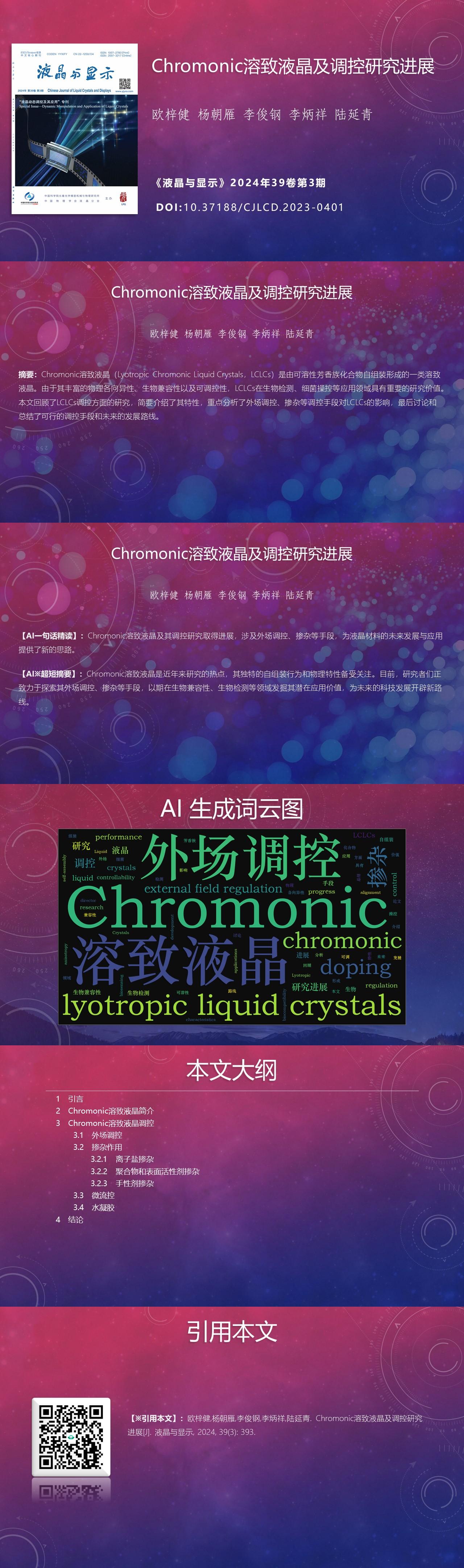 Zijian OU, Zhaoyan YANG, Jungang LI, Bingxiang LI, Yanqing LU. Research progress on performance regulation of lyotropic chromonic liquid crystals[J]. Chinese Journal of Liquid Crystals and Displays, 2024, 39(3): 393