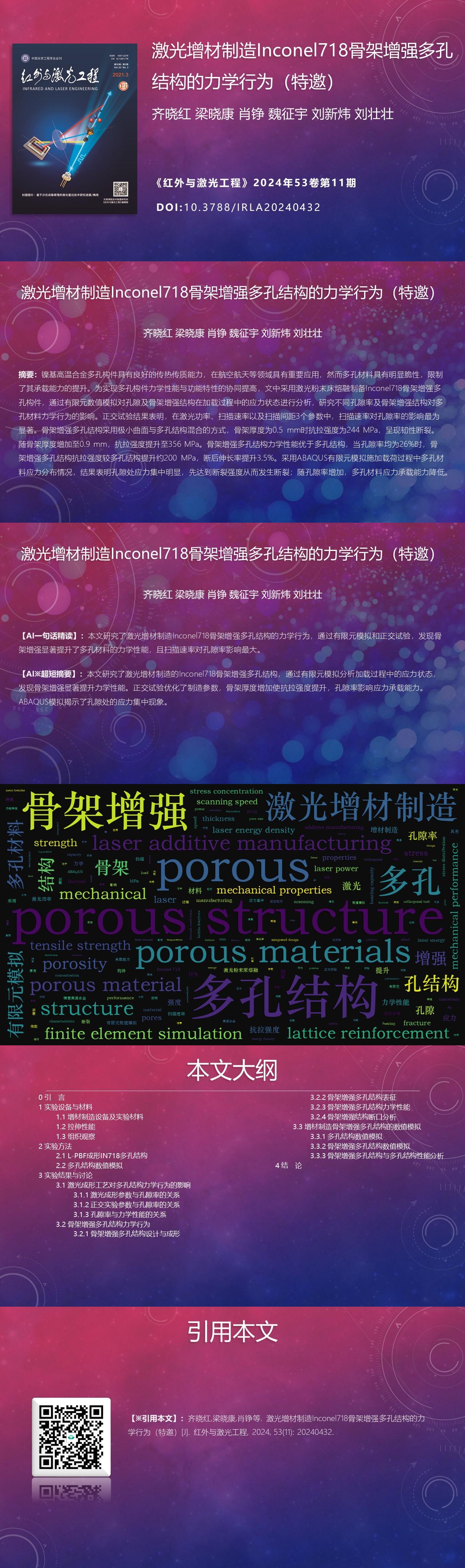 Results and DiscussionsThis paper designs and forms a lattice-reinforced porous structure. The porosity of the L-PBF manufactured IN718 porous structure increases exponentially as the laser energy density decreases, while the tensile strength of the porous structure decreases exponentially with increasing porosity. Tensile tests show that the porous structure primarily exhibits brittle fracture, with unmolten powder particles and irregular pores leading to stress concentration and crack initiation during stretching. Simulation results indicate that the stress in the lattice-reinforced porous structure is primarily borne by the lattice, with increased thickness enhancing structural strength. The mechanical properties of the lattice-reinforced porous structure are positively correlated with the thickness of the lattice, and the reinforcing effect becomes more pronounced with increasing porosity.