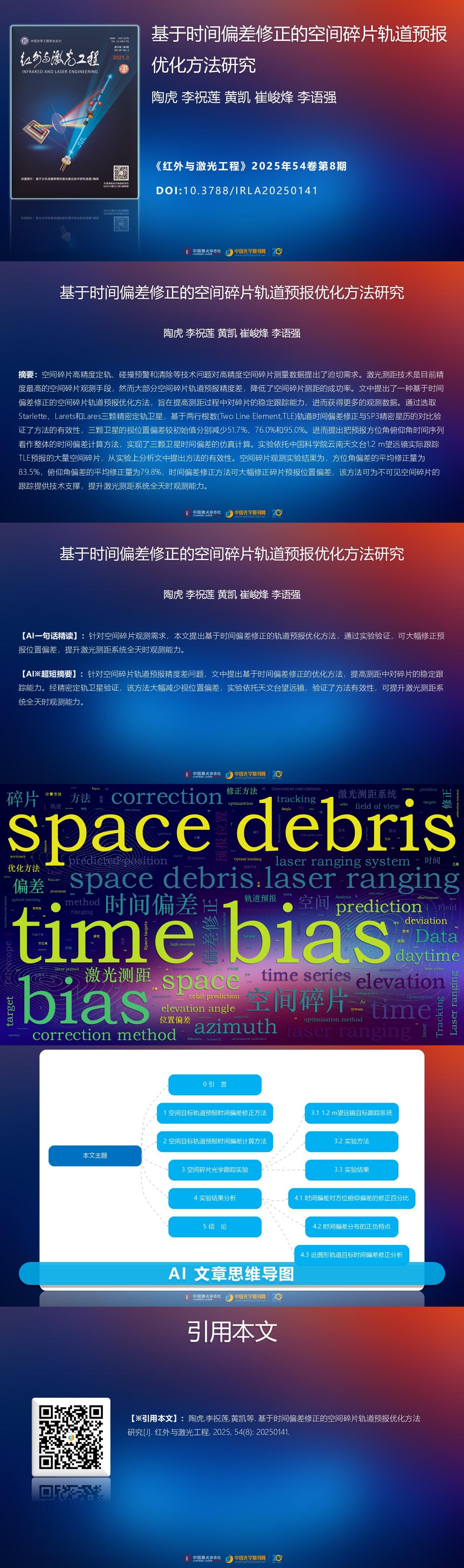 ConclusionsThis study proposes a space debris position prediction optimization method based on time bias correction. Theoretical calculations and experimental validation demonstrated that this method can significantly improve the accuracy of space debris position prediction, reduce positional bias within the telescope's field of view, and decrease the distance deviation between the observation station and the target. This provides methodological support for stable tracking of space debris and enhances the success rate of laser ranging to space debris. Analysis of observational data also revealed that the shape of the orbit is a key factor influencing the time bias of space debris, and that some space debris exhibits a pattern of positive and negative time bias. The time bias correction method not only improves the tracking stability of space targets during twilight periods but can also be extended to daytime observations. In particular, for specific space debris in Earth's shadow regions, the regularity of the time bias can be used to optimize search strategies, improve search efficiency, and avoid blind searches.