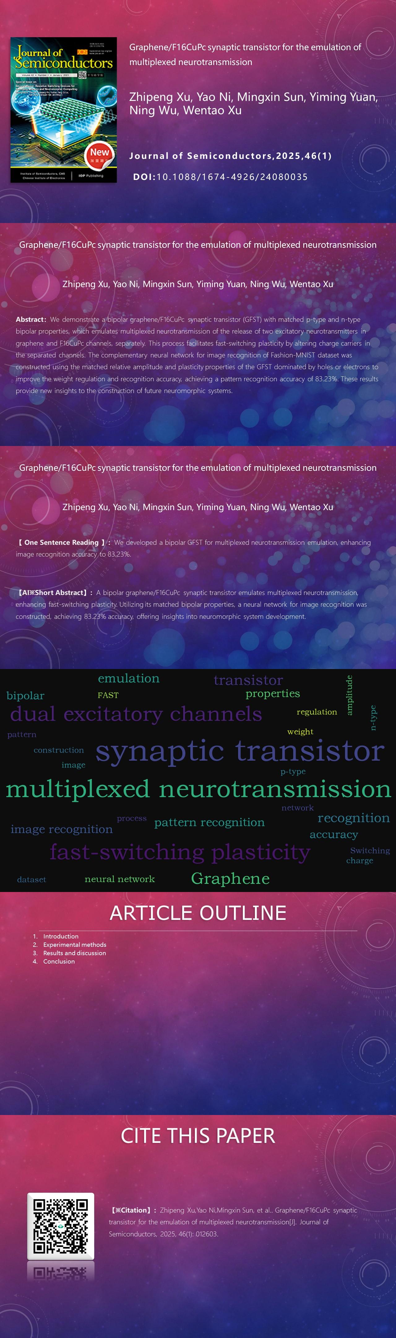 In conclusion, a p-type and n-type performance-matched bipolar GFST was proposed in this paper. Based on the bipolar characteristic of the device, the selective release of two different excitatory neurotransmitters as well as the emulation of different neurotransmitter-mediated synaptic plasticity were achieved by adjusting the polarity of gate voltage, which simulated multiplexed neurotransmission. Further by switching the VGS, fast switching of plasticity was realized. Finally, a complementary neural network for image recognition of Fashion-MNIST dataset was constructed by utilizing the matched relative amplitude and plasticity properties of the GFST dominated by holes or electrons to improve the weight regulation and recognition accuracy, and a recognition rate of 83.23% was achieved after 40 epochs. This work extends the plasticity regulation range of single synaptic device, enriches the functional diversity of device, and provides new perspectives for building more realistic neuromorphic systems.