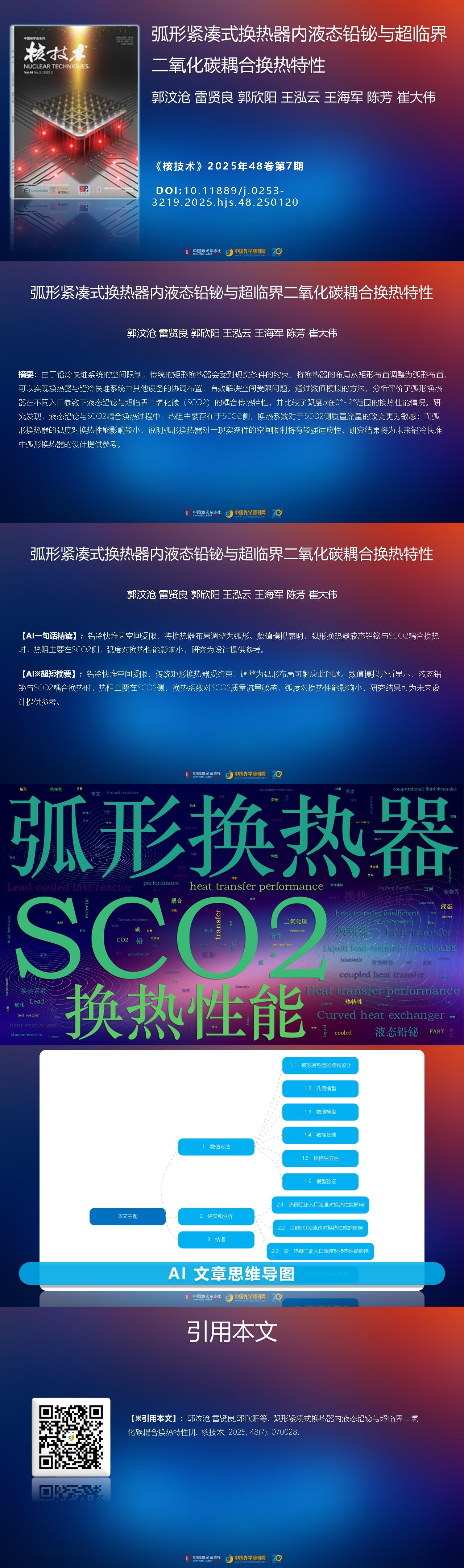 Wencang GUO, Xianliang LEI, Xinyang GUO, Hongyun WANG, Haijun WANG, Fang CHEN, Dawei CUI. Heat transfer characteristics of liquid lead-bismuth eutectic coupled with supercritical carbon dioxide in a compact curved heat exchanger[J]. NUCLEAR TECHNIQUES, 2025, 48(7): 070028