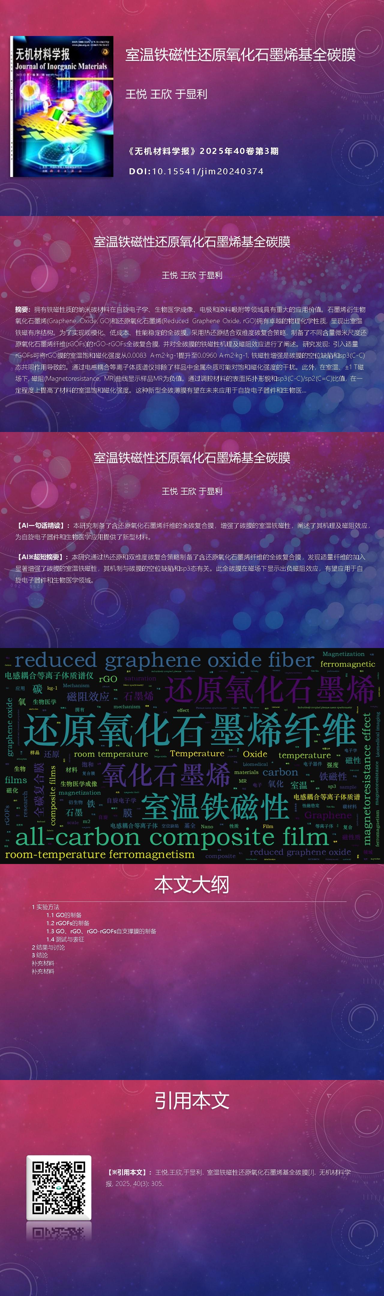Nano carbon materials with ferromagnetism have significant application value in fields such as spintronics, biomedical imaging, electrodes, and dye adsorption. Graphene derivatives graphene oxide (GO) and reduced graphene oxide (rGO) exhibit excellent physical and chemical properties, presenting a room temperature ferromagnetic ordered structure. In order to achieve large-scale, low-cost, and stable performance of all-carbon films, a dual dimensional carbon composite strategy combining thermal reduction was adopted to prepare composite films of micro reduced graphene oxide fibers (rGOFs) and nano scale rGO sheets, and the ferromagnetic mechanism of all-carbon films was explained partially. This work prepared rGO-rGOFs all-carbon composite films with different masses of rGOFs, focusing on the ferromagnetic mechanism and magnetoresistance effect of the materials. The research results find that introducing a certain amount of rGOFs can increase the room temperature saturation magnetization of rGO films from 0.0083 to 0.0960 A·m2·kg-1. Enhancement of the ferromagnetism is achieved through combined effect of vacancy type defects and sp3(C-C) states in carbon film. Interference of metal impurities in the sample, which may affect the saturation magnetization, is eliminated by inductively coupled plasma mass spectrometry. In addition, at room temperature and ±1 T magnetic field, the magnetoresistance (MR) curve shows MR value of sample is negative. By regulating the surface topology and sp3(C-C)/sp2(C=C) ratio of the material, the room temperature saturation magnetization has been improved to a higher extent. In short, this new type of all-carbon thin film is expected to be applied to spintronic devices and biomedical fields in the near future.