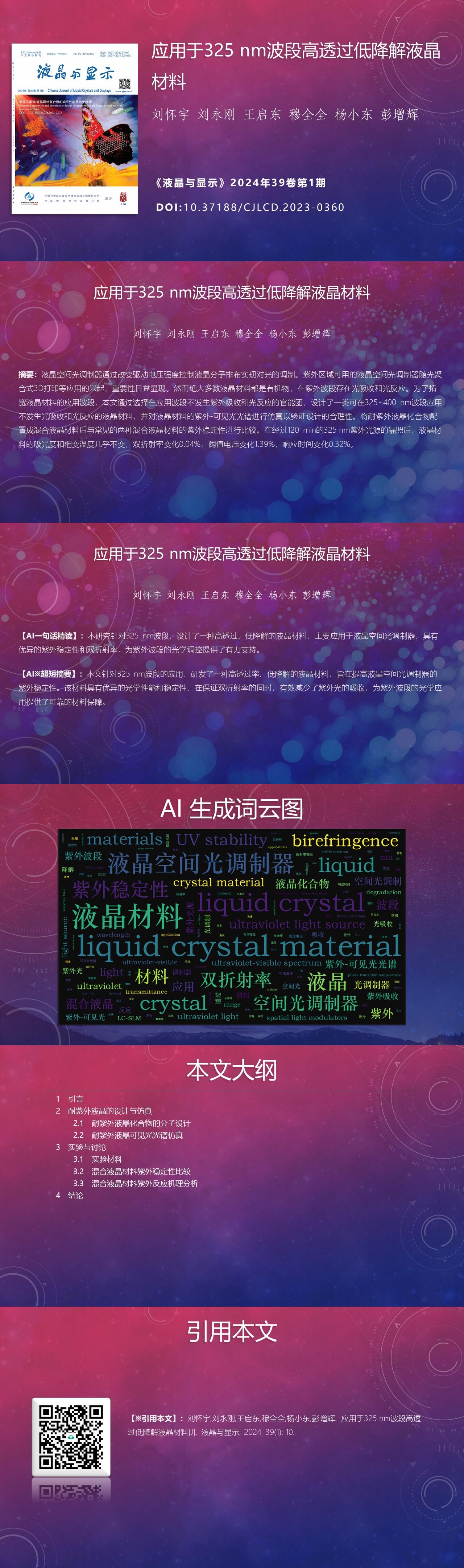 Huaiyu LIU, Yonggang LIU, Qidong WANG, Quanquan MU, Xiaodong YANG, Zenghui PENG. High transmittance and low degradation liquid crystal materials applied in the 325 nm wavelength range[J]. Chinese Journal of Liquid Crystals and Displays, 2024, 39(1): 10