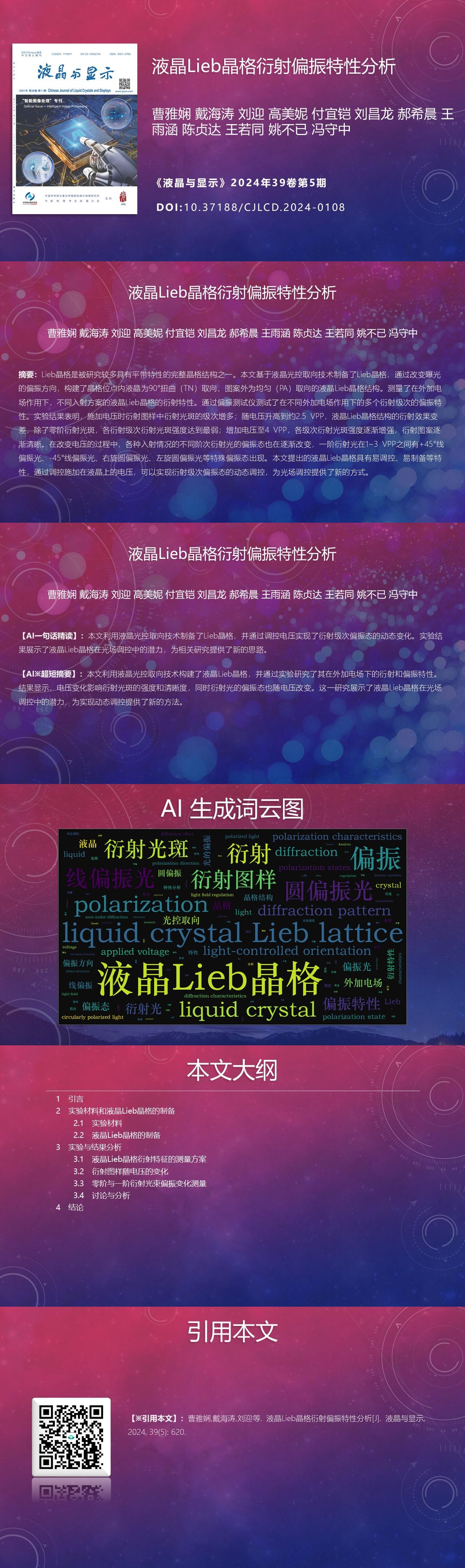 Yaxian CAO, Haitao DAI, Ying LIU, Meini GAO, Yikai FU, Changlong LIU, Xichen HAO, Yuhan WANG, Zhenda CHEN, Ruotong WANG, Buyi YAO, Shouzhong FENG. Analysis of polarization characteristics of liquid crystal Lieb lattice diffraction[J]. Chinese Journal of Liquid Crystals and Displays, 2024, 39(5): 620