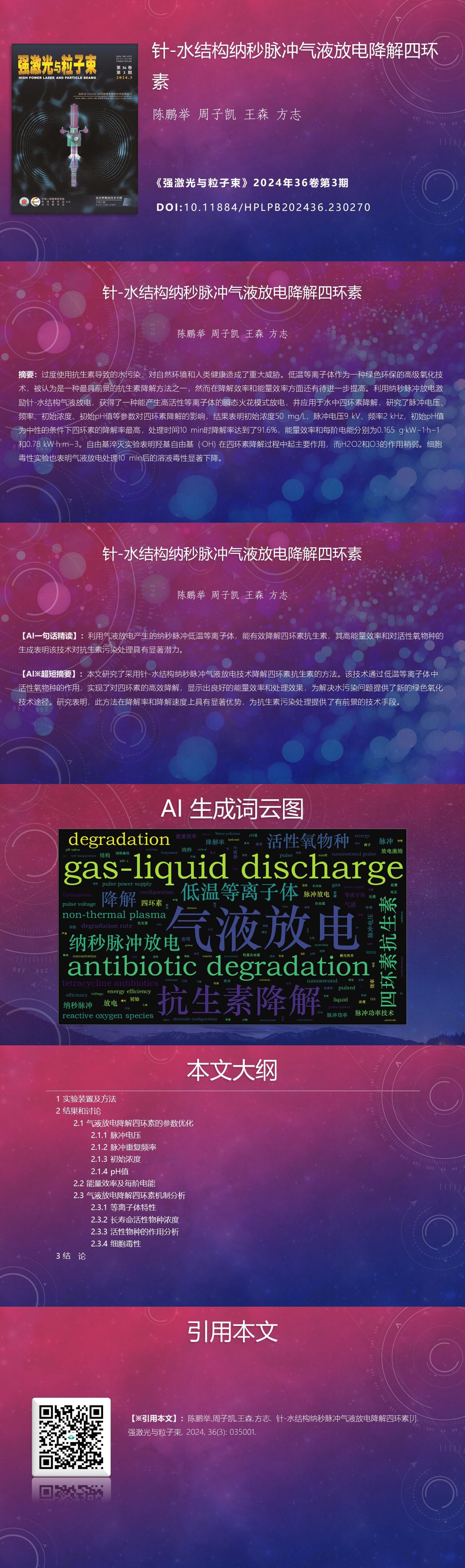 Pengju Chen, Zikai Zhou, Sen Wang, Zhi Fang. Optimization of tetracycline degradation by nanosecond pulsed gas-liquid discharge with needle-water configuration[J]. High Power Laser and Particle Beams, 2024, 36(3): 035001