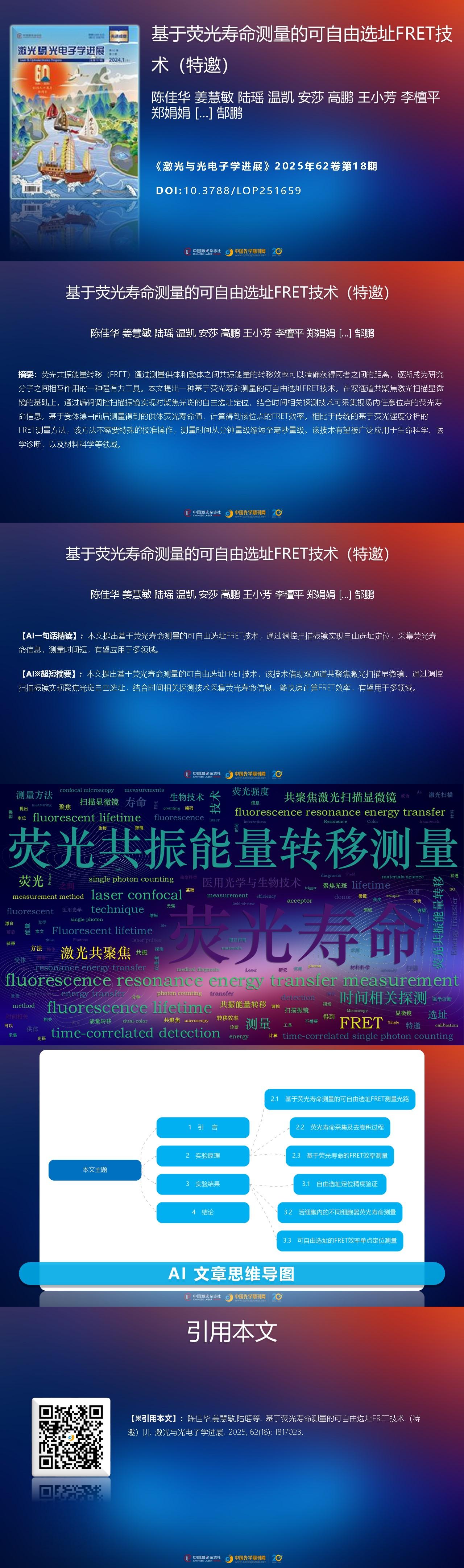 Jiahua Chen, Huimin Jiang, Yao Lu, Kai Wen, Sha An, Peng Gao, Xiaofang Wang, Tanping Li, Juanjuan Zheng, Hongfei Suo, Lixin Liu, Peng Gao. Free-Addressing FRET Technique Based on Fluorescent Lifetime Detection (Invited)[J]. Laser & Optoelectronics Progress, 2025, 62(18): 1817023