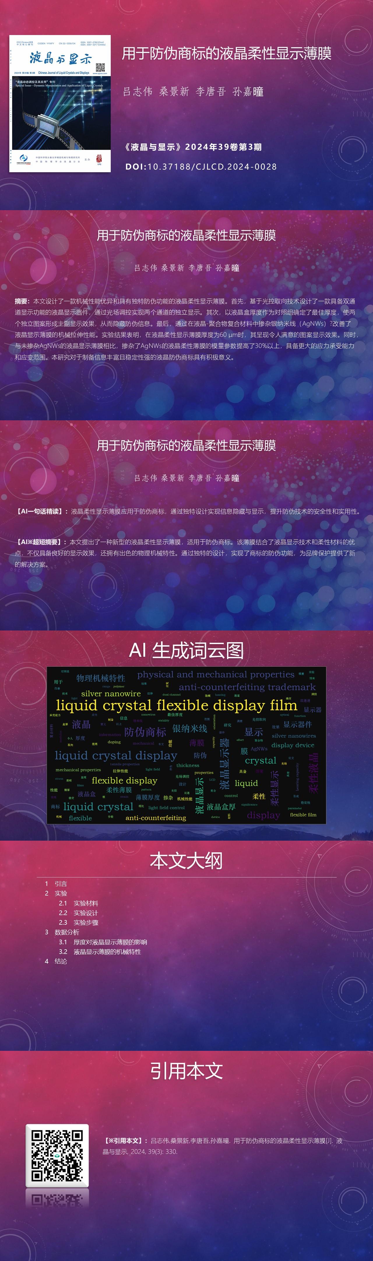 Zhiwei LÜ, Jingxin SANG, Tangwu LI, Jiatong SUN. Liquid crystal flexible display film suitable for anti-counterfeiting trademarks[J]. Chinese Journal of Liquid Crystals and Displays, 2024, 39(3): 330