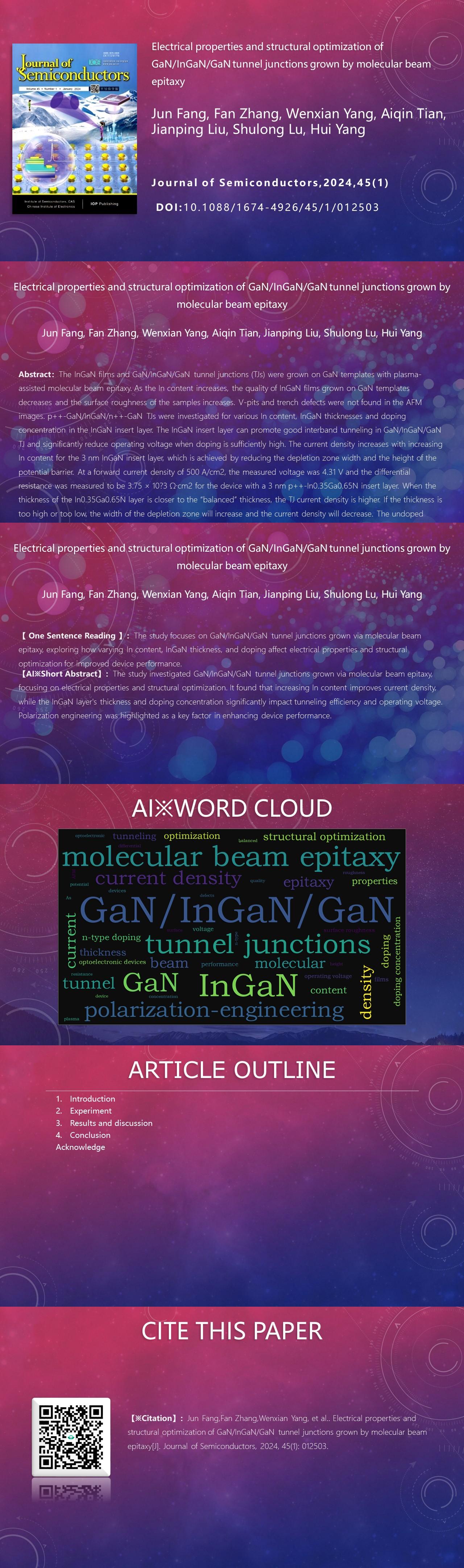Tunnel junctions (TJs) provide a promising method for the hole injection of p-type GaN. Several research groups have reported preliminary studies of TJs[1−5]. In reverse biased TJs, electrons in the valence band of p-type materials tunnel into the conduction band of n-type materials. Efficient tunneling junctions in Ⅲ-nitride devices can help achieve new device structures and also enhance the performance of electronic and optoelectronic devices[6−10]. However, the low efficiency of the interband tunneling process hinders the widespread application of TJs in electronic and optoelectronic devices. Polarization engineering can overcome the inherent obstacles of these materials. This is done by using the interfacial polarization of the GaN/AlGaN/GaN[11, 12] or GaN/InGaN/GaN[6, 13, 14] junction to induce the high electric field so that the valence band and conduction band on both sides of the junction are aligned. When the InGaN barrier with a lower band gap is used, the decrease of the depletion width and the decrease of the energy barrier results in the high reverse current density[15] of the GaN-based tunnel junction and the tunneling characteristics of the negative differential resistance[16, 17].