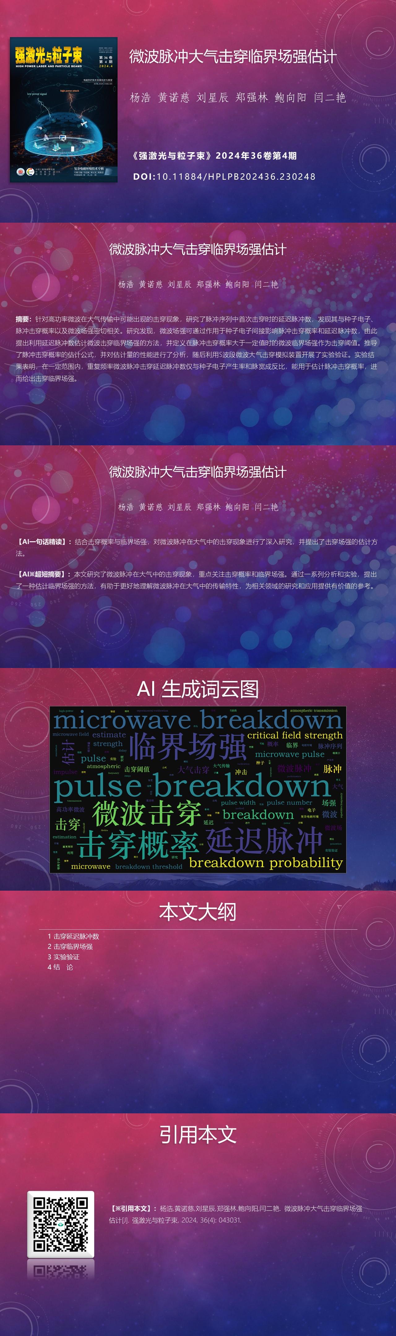 Hao Yang, Nuoci Huang, Xingchen Liu, Qianglin Zheng, Xiangyang Bao, Eryan Yan. Critical field strength estimation for microwave pulse atmospheric breakdown[J]. High Power Laser and Particle Beams, 2024, 36(4): 043031
