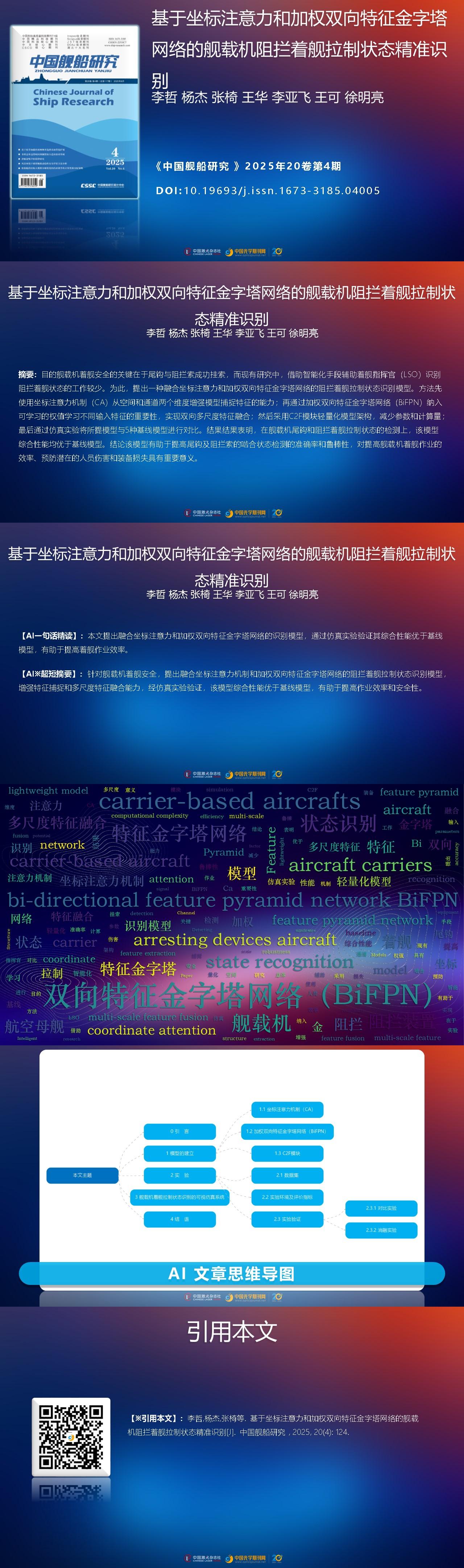 Zhe LI, Jie YANG, Yi ZHANG, Hua WANG, Yafei LI, Ke WANG, Mingliang XU. Accurate arrested landing state recognition of carrier-based aircraft based on coordinate attention and weighted bi-directional feature pyramid network[J]. Chinese Journal of Ship Research, 2025, 20(4): 124