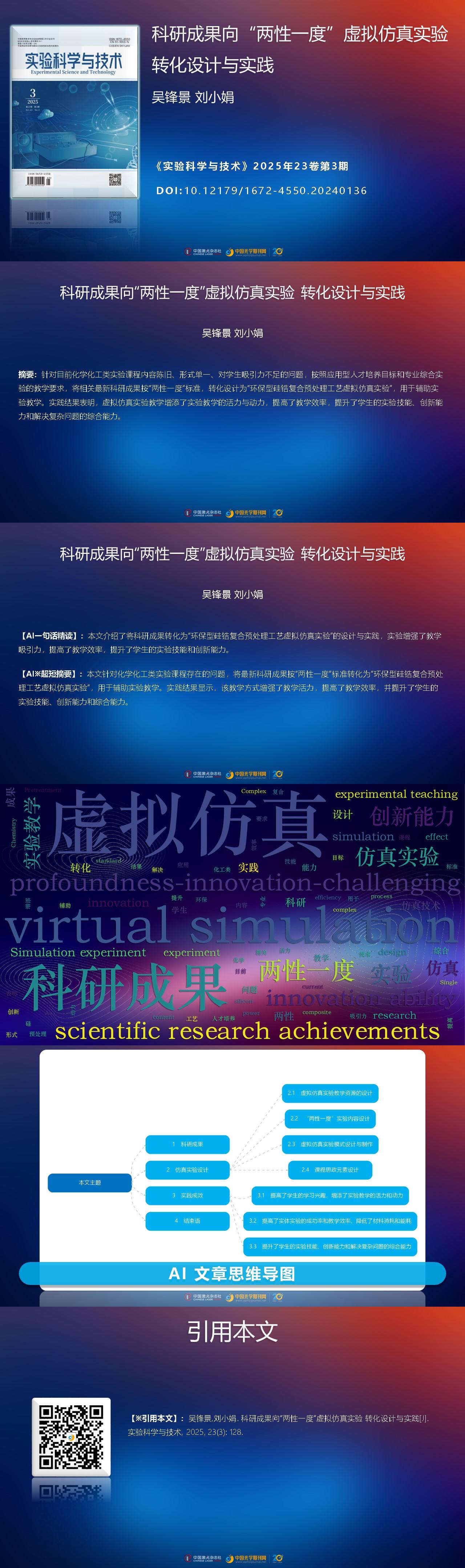 Fengjing WU, Xiaojuan LIU. Conversion Design and Practical Effect of Scientific Research Achievements into “Profoundness-Innovation-Challenging” Virtual Simulation Experiment Teaching[J]. Experiment Science and Technology, 2025, 23(3): 128