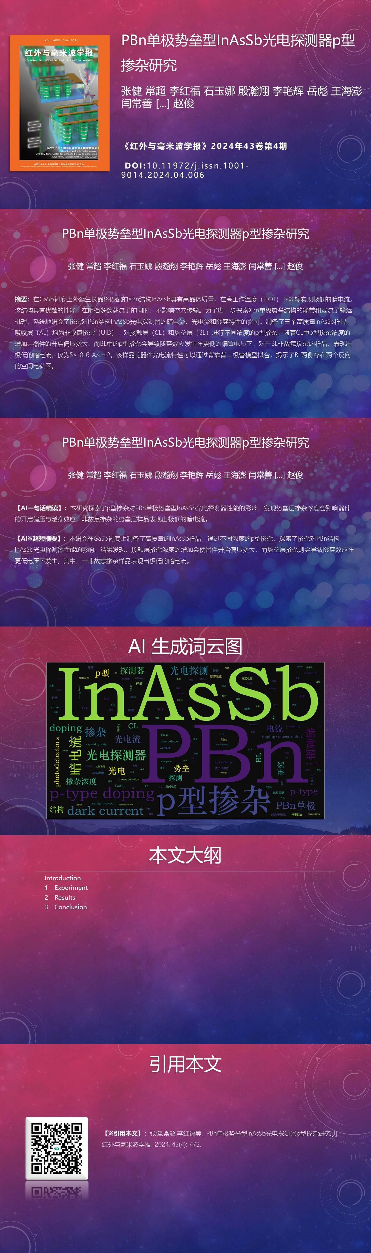 【AIGC One Sentence Reading】:本研究探索了p型掺杂对PBn单极势垒型InAsSb光电探测器性能的影响,发现势垒层掺杂浓度会影响器件的开启偏压与隧穿效应,非故意掺杂的势垒层样品表现出极低的暗电流。