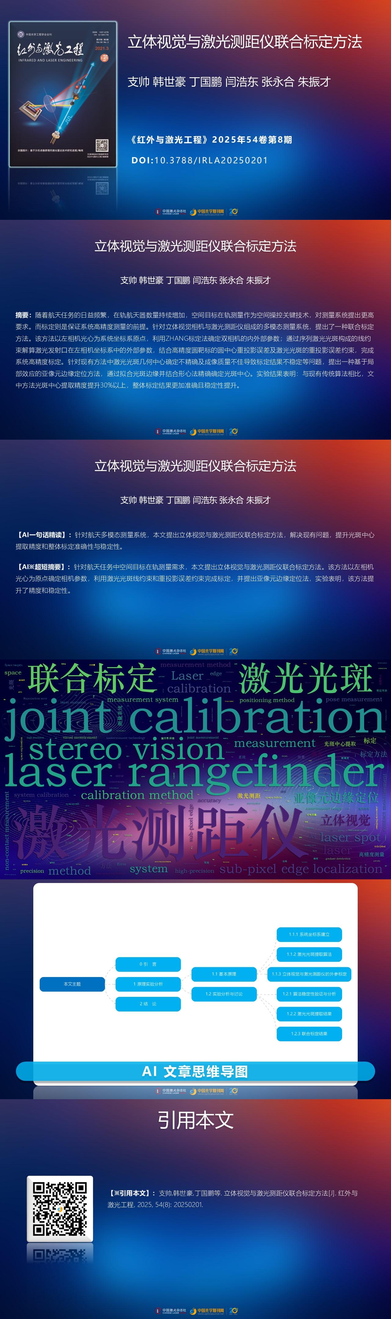 ObjectiveWith the rapid development of complex space missions such as deep-space exploration, on-orbit services, and space debris removal, pose measurement technology for space targets has emerged as a core enabler for autonomous spacecraft operations and mission safety. Accurate pose measurement is directly critical to the successful execution of space missions, highlighting the critical supporting role of this technology in space tasks. As a non-contact measurement method, visual measurement has been widely adopted due to its advantages of low cost, simple installation, and high precision. However, a single visual sensor has significant limitations due to factors such as illumination and measurement range constrains. To enhance mission success rates, multi-sensor joint measurement has become the mainstream solution. The combined use of stereo vision and laser rangefinders can complement each other's advantages, effectively addressing issues such as low initial ranging accuracy, high algorithm redundancy, and weak image information display capabilities, while retaining the benefits of non-contact measurement, fast speed, and easy automation, thus showing broad application prospects in the aerospace field. Calibration between sensors is a prerequisite for ensuring high-precision system measurement. To guarantee the measurement accuracy of the entire system, the relative installation matrix between sensors must be accurately determined, necessitating high-precision joint calibration of the measurement system.