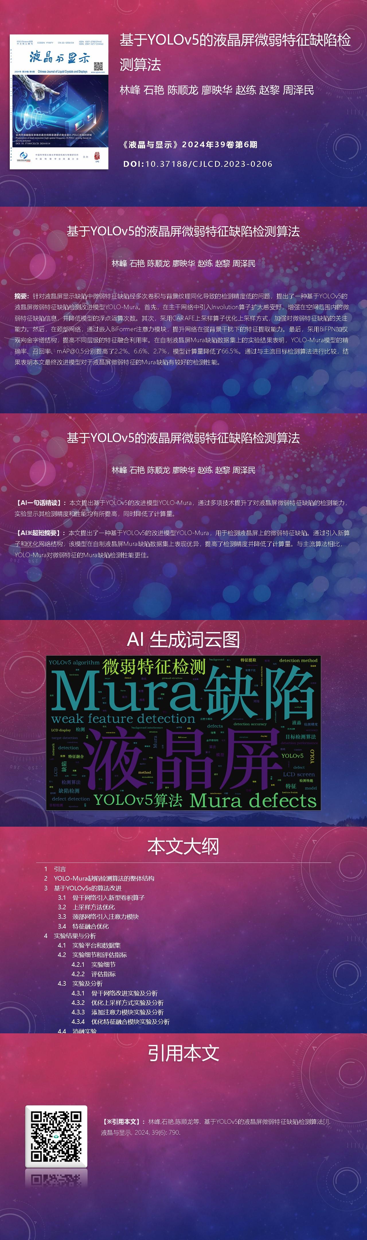 Feng LIN, Yan SHI, Shunlong CHEN, Yinghua LIAO, Lian ZHAO, Li ZHAO, Zemin ZHOU. Weak feature defect detection method for LCD screens based on YOLOv5[J]. Chinese Journal of Liquid Crystals and Displays, 2024, 39(6): 790