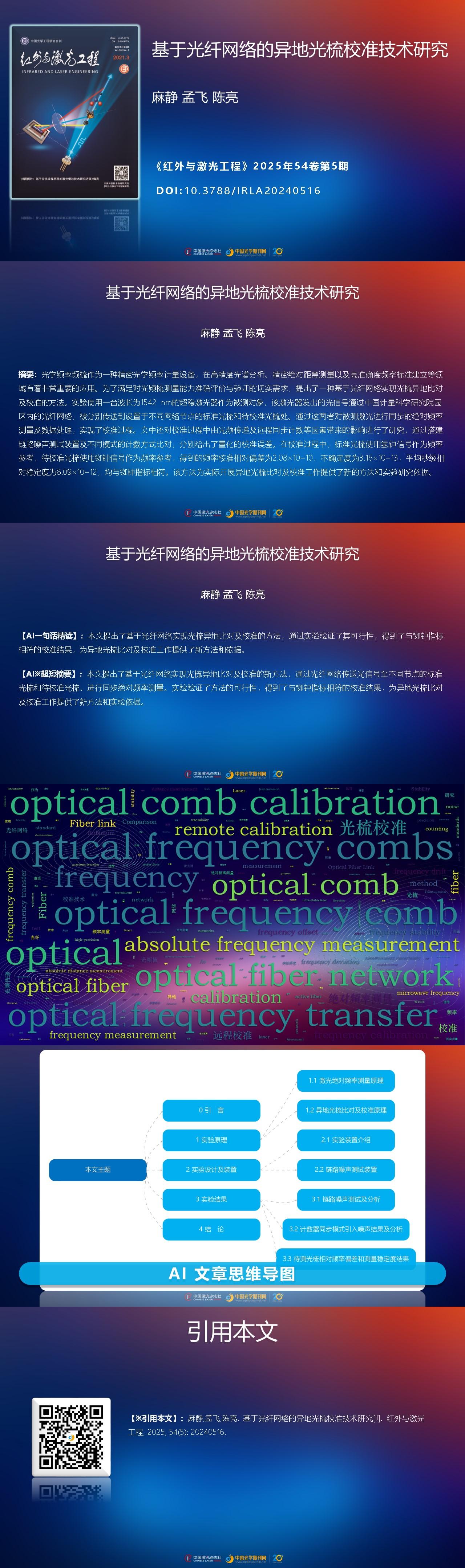 ObjectiveOptical frequency combs, which are critical for bridging microwaves and optics, represent significant advancements in optical frequency metrology. They are of paramount importance for high-precision spectral analysis, accurate absolute distance measurement, and the high-precision frequency standards establishment. Several metrology institutions in China have established optical wavelength and frequency standard devices based on optical frequency combs, providing traceability to microwave frequency standards for precise laser sources like frequency-stabilized lasers, ensuring accurate and reliable measurement of related quantities in industrial and research fields. As standard devices, optical frequency comb systems must undergo the same traceability process—comparison and calibration—to ensure accurate and reliable measurement values. However, due to their complex structure and large volume, the optical frequency comb devices used in practice are challenging to move for calibration. Therefore, the authors proposes a method of optical frequency comb comparison based on optical fiber network and optical "common-view method," mainly for the calibration of remote optical frequency combs, thus achieving regular traceability and calibration of optical frequency combs.
