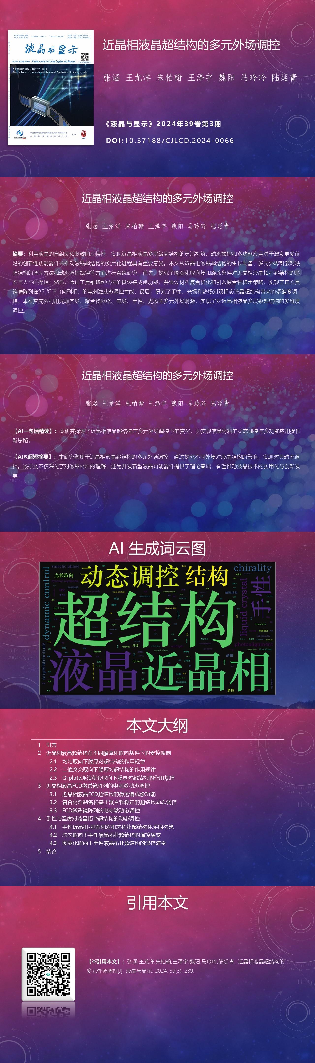 Han ZHANG, Longyang WANG, Bohan ZHU, Zeyu WANG, Yang WEI, Lingling MA, Yanqing LU. Modulation of smectic liquid crystals superstructures under multiple external fields[J]. Chinese Journal of Liquid Crystals and Displays, 2024, 39(3): 289