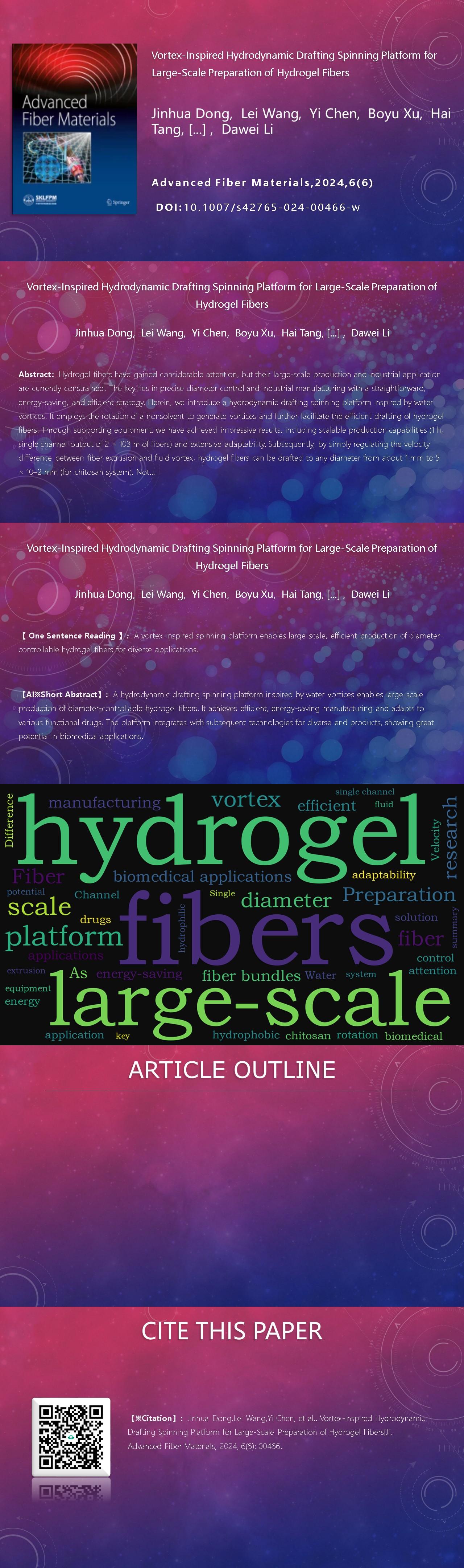 Jinhua Dong, Lei Wang, Yi Chen, Boyu Xu, Hai Tang, Ziqiang Zhao, Weikang Lin, Huijing Hu, Peihang Li, Runfeng Cao, Long Wang, Lei Zhang, Yunlang She, Bingyao Deng, Weiyan Sun, Chang Chen, Dawei Li. Vortex-Inspired Hydrodynamic Drafting Spinning Platform for Large-Scale Preparation of Hydrogel Fibers[J]. Advanced Fiber Materials, 2024, 6(6): 00466