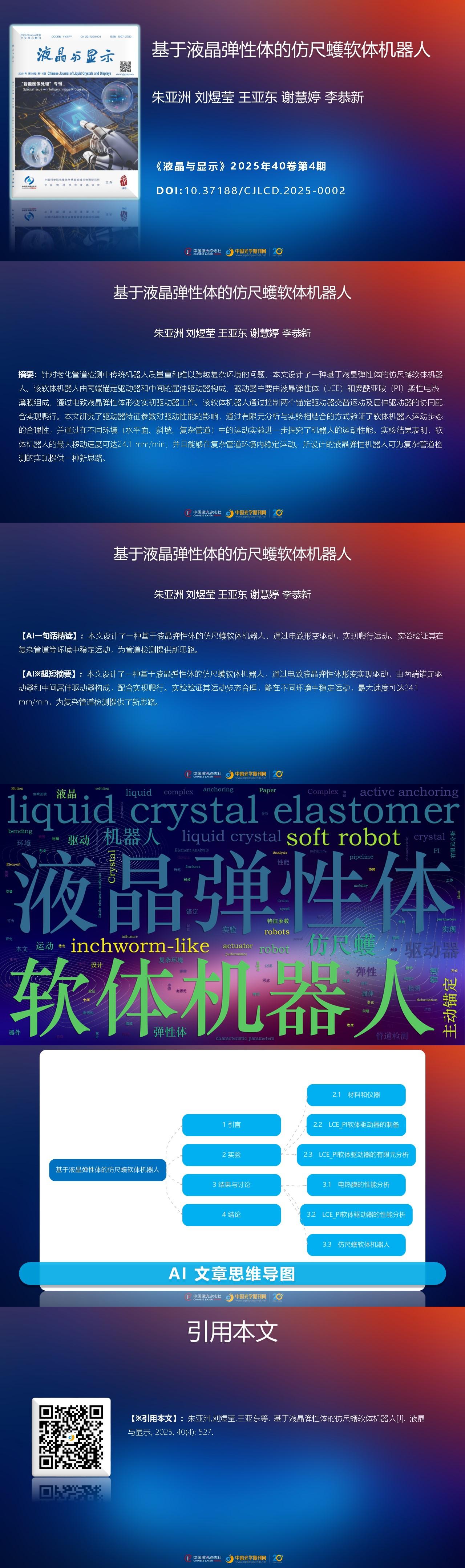 Yazhou ZHU, Yuying LIU, Yadong WANG, Huiting XIE, Gongxin LI. Inchworm-like soft robot based on liquid crystal elastomer[J]. Chinese Journal of Liquid Crystals and Displays, 2025, 40(4): 527