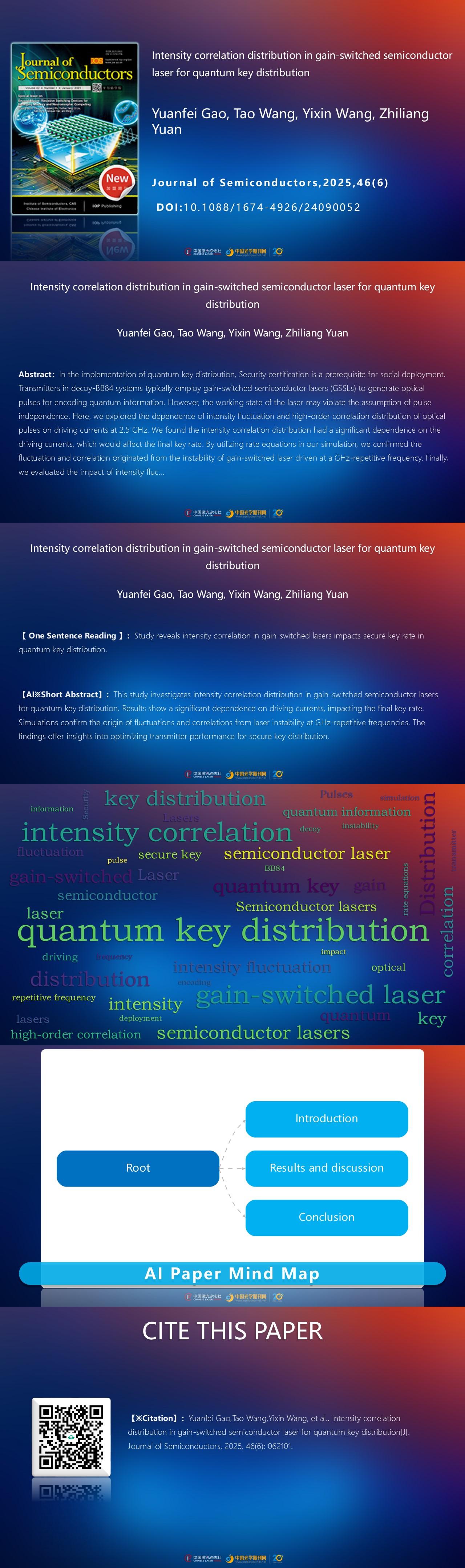 Yuanfei Gao, Tao Wang, Yixin Wang, Zhiliang Yuan. Intensity correlation distribution in gain-switched semiconductor laser for quantum key distribution[J]. Journal of Semiconductors, 2025, 46(6): 062101